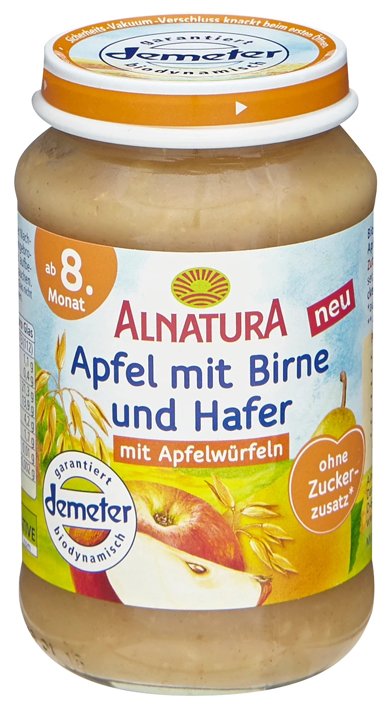 Bio Apfel-Birne-Früchtezubereitung mit Apfelwürfeln und Vollkorn