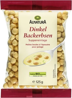Alnatura Dinkel Backerbsen sind eine knusprige, aus Dinkelmehl hergestellte Suppeneinlage. Sie eignen sich auch als herzhaftes Knabbergebäck.