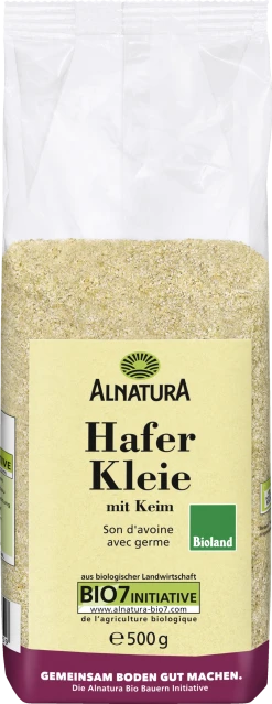 Diese Bio-Kleie wird aus den Randschichten des vollen Haferkorns hergestellt, der Keim bleibt erhalten. Sie ist vielseitig zu verwenden und passt beispielsweise in Müsli und Joghurt, Smoothie-Kreationen oder als Zutat in herzhafte und süße Backwaren. Das Getreide für die Alnatura Haferkleie mit Keim stammt aus Bioland-Anbau.
