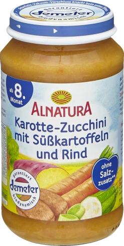 Karotten* 42 %, Wasser, Süßkartoffeln** 8 %, Rindfleisch* 8 %,Zucchini* 6 %, Maismehl* 3 %, Lauch* 3 %, Rapsöl** 1,6 %*aus biodynamischem Landbau**aus biologischer Landwirtschaft .