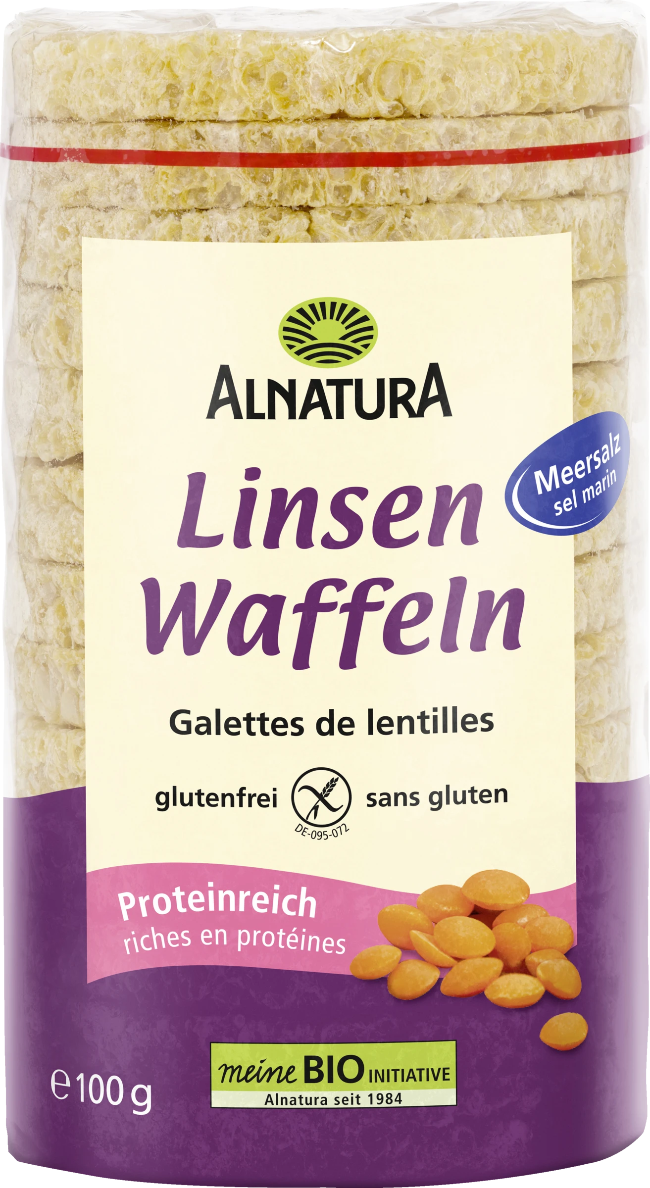 Diese knusprigen Waffeln überraschen mit nur zwei Zutaten: Linsenmehl aus Bio-Landbau und Meersalz. Mit ihrem feinen Geschmack sorgen sie für Abwechslung am Gaumen, sowohl pur geknabbert als auch mit Dip genossen oder mit süßem und auch herzhaftem Belag – zum Beispiel Hummus, Avocado oder Nussmus. Die Alnatura Linsenwaffeln mit Meersalz sind eine proteinreiche Ballaststoffquelle sowie glutenfrei und vegan.