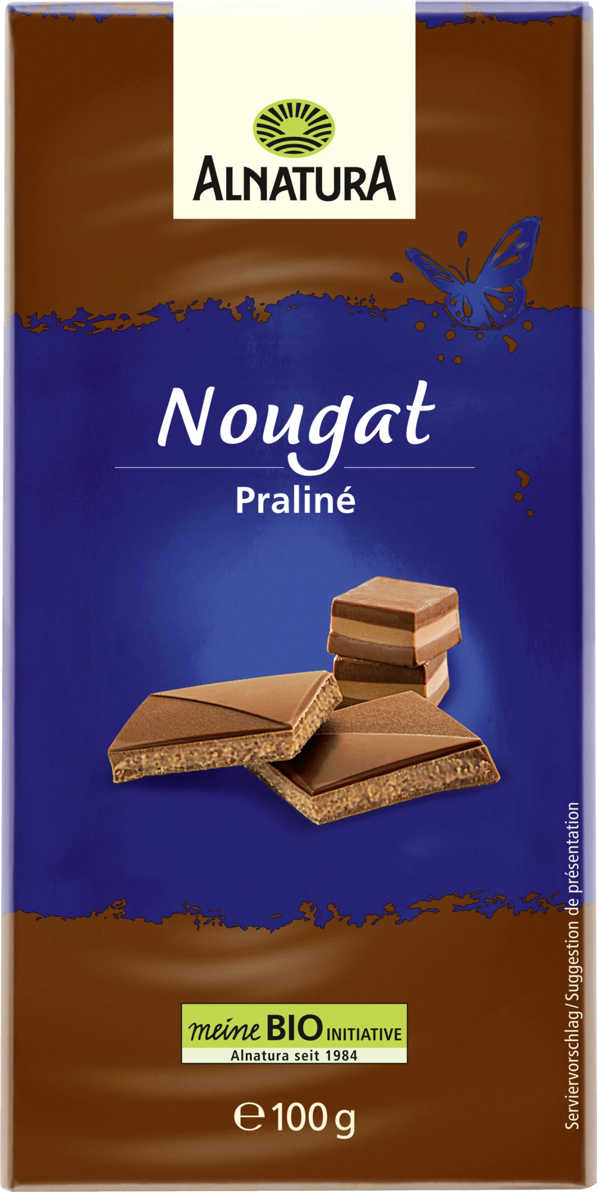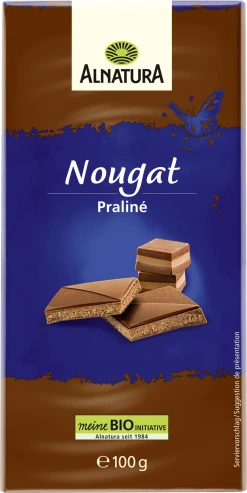 Zart im Schmelz, nussig-süß im Geschmack. Die Alnatura Nougat-Schokolade ist mit einer aromatischen Nussnougatschicht gefüllt. Sie wird ohne Lecithine hergestellt. Alle Zutaten stammen aus biologischer Landwirtschaft.