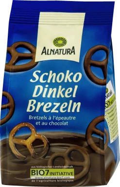 Für die Alnatura Schoko-Dinkelbrezeln werden knusprige, leicht gesalzene Dinkel-Laugenbrezeln mit zartschmelzender Vollmilchschokolade überzogen. Ein salzig-süßer Bio-Snack für jede Gelegenheit.