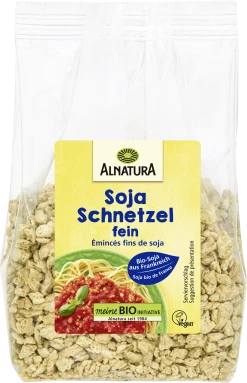 Bolognese, Chili sin Carne und andere Lieblingsgerichte ganz ohne Hackfleisch? Gelingt ganz leicht mit den veganen Alnatura Sojaschnetzeln fein: Entweder in Gemüsebrühe aufkochen, quellen lassen und wie Hackfleisch anbraten oder trocken in Saucen oder Eintöpfe geben, mitkochen und bei Bedarf Wasser zufügen. Die Sojabohnen für die Schnetzel werden in Frankreich nach Bio-Richtlinien angebaut.
