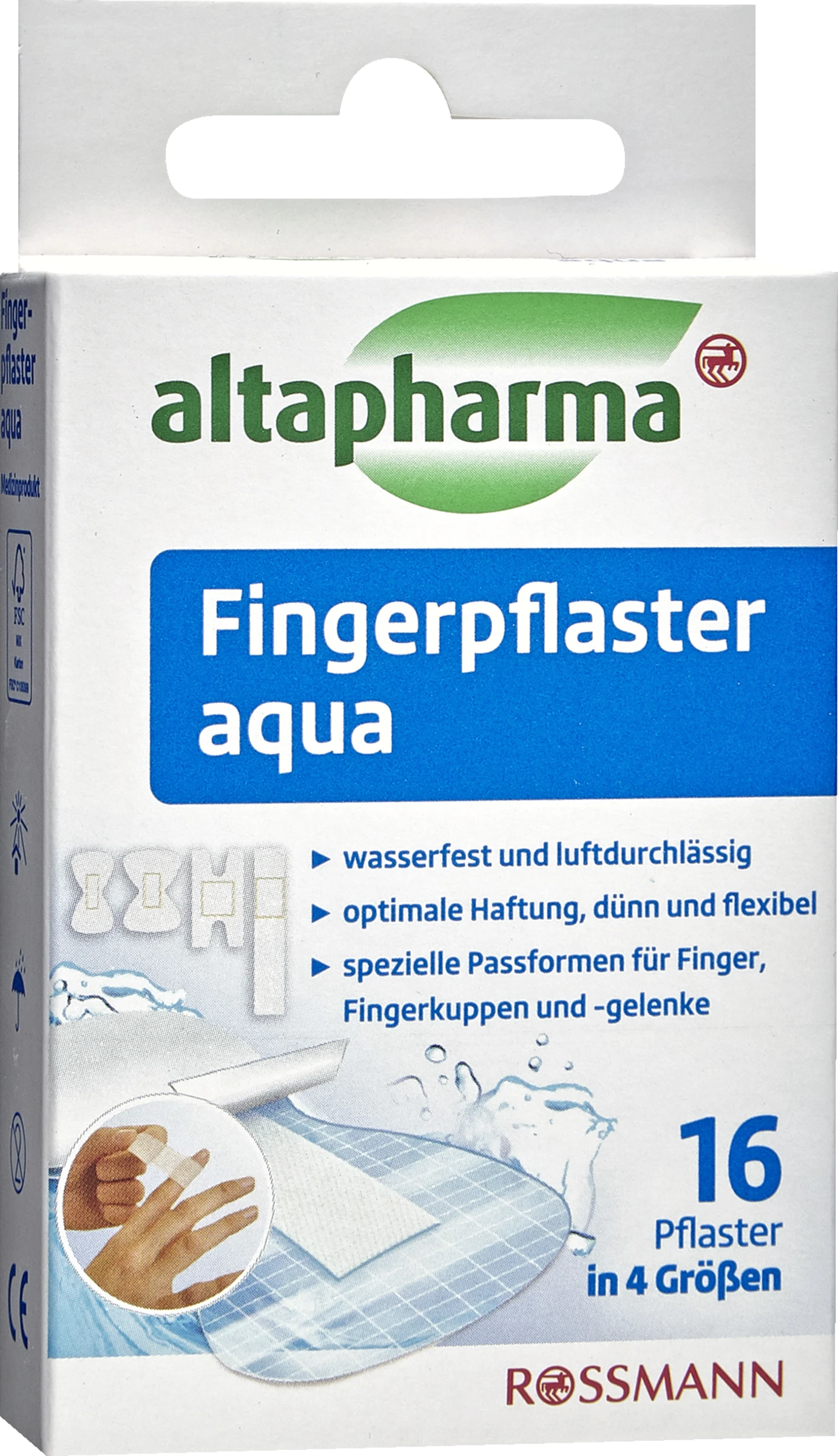 Altapharma Fingerpflaster aqua eignen sich speziell zur Abdeckung von Hautverletzungen an Fingern, Fingerkuppen und Fingergelenken. Sie sind luftdurchlässig, schmutzabweisend und wasserfest und schützen die Wunde vor Wasser beim Waschen, Baden und Duschen. Dank des speziellen, dünnen Material haften die Pflaster ideal auf der Haut, sie sind dünn, flexibel und kleben zuverlässig und strapazierfähig wegen des speziellen Gewebes. Die Pflaster sind hautfreundlich und dermatologisch bestätigt. Latexfrei.