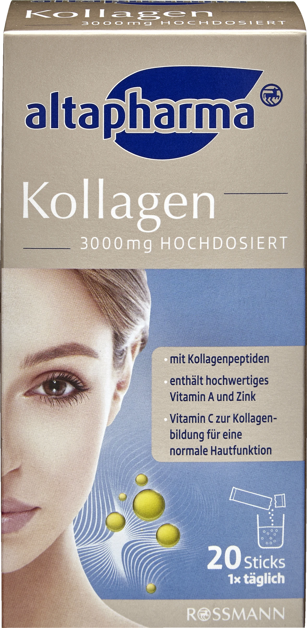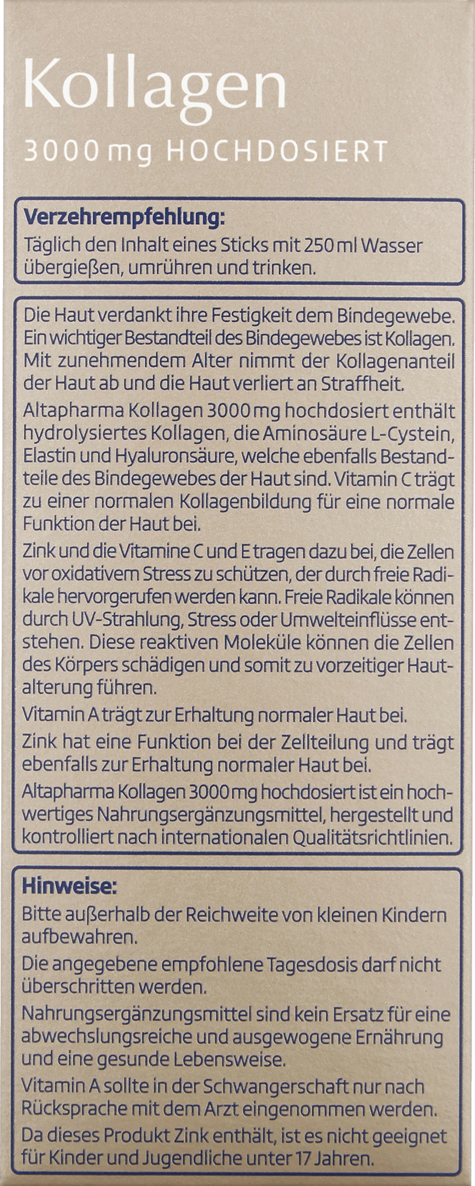 Altapharma Kollagen 3000 mg hochdosiert ist ein hochwertiges Nahrungsergänzungsmittel, hergestellt und kontrolliert nach internationalen Qualitätsrichtlinien.