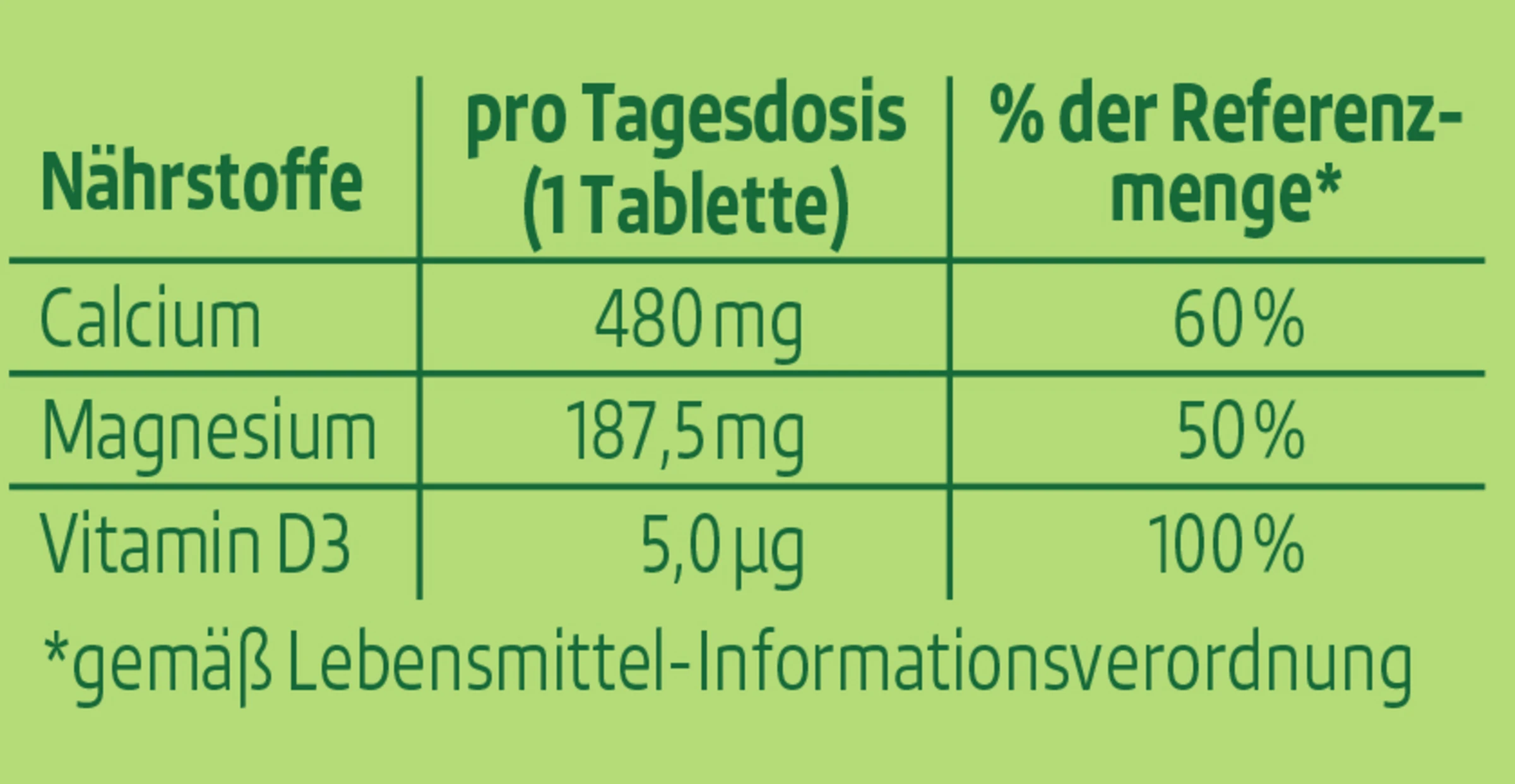 Magnesium und Calcium sind lebensnotwendige Mineralstoffe, die zum Erhalt normaler Knochen und einer normalen Muskelfunktion beitragen. Vitamin D trägt zu einer normalen Aufnahme und Verwertung von Calcium bei.