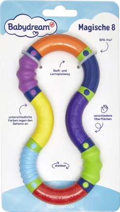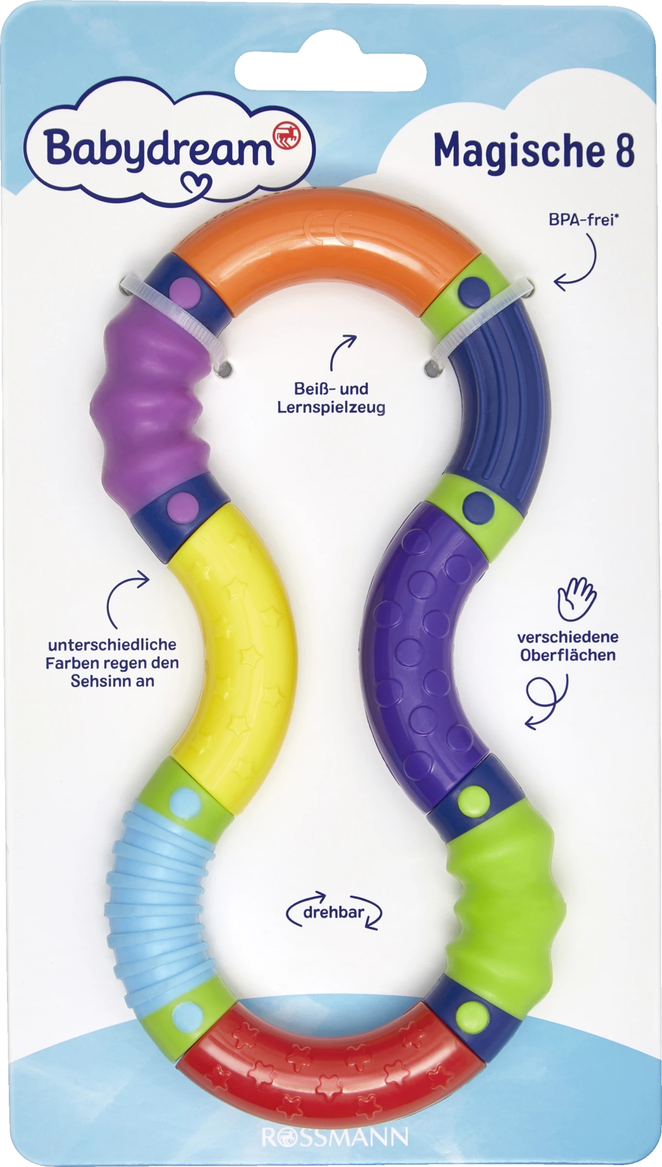 Unsere Babydream Magische 8 ist ein spannendes Lernspielzeug für Ihr Baby und kann gleichzeitig als Beißring benutzt werden. Die Magische 8 lässt sich in verschiedene Richtungen drehen und hilft Ihrem Kind spielerisch dabei, unterschiedliche Farben und Oberflächen zu erkennen sowie den Tastsinn zu verfeinern und die Geschicklichkeit zu trainieren. Alle verwendeten Materialien sind farbecht und unbedenklich. Geeignet für Babys ab 6 Monaten. BPA FREI laut EU-Verordnung.