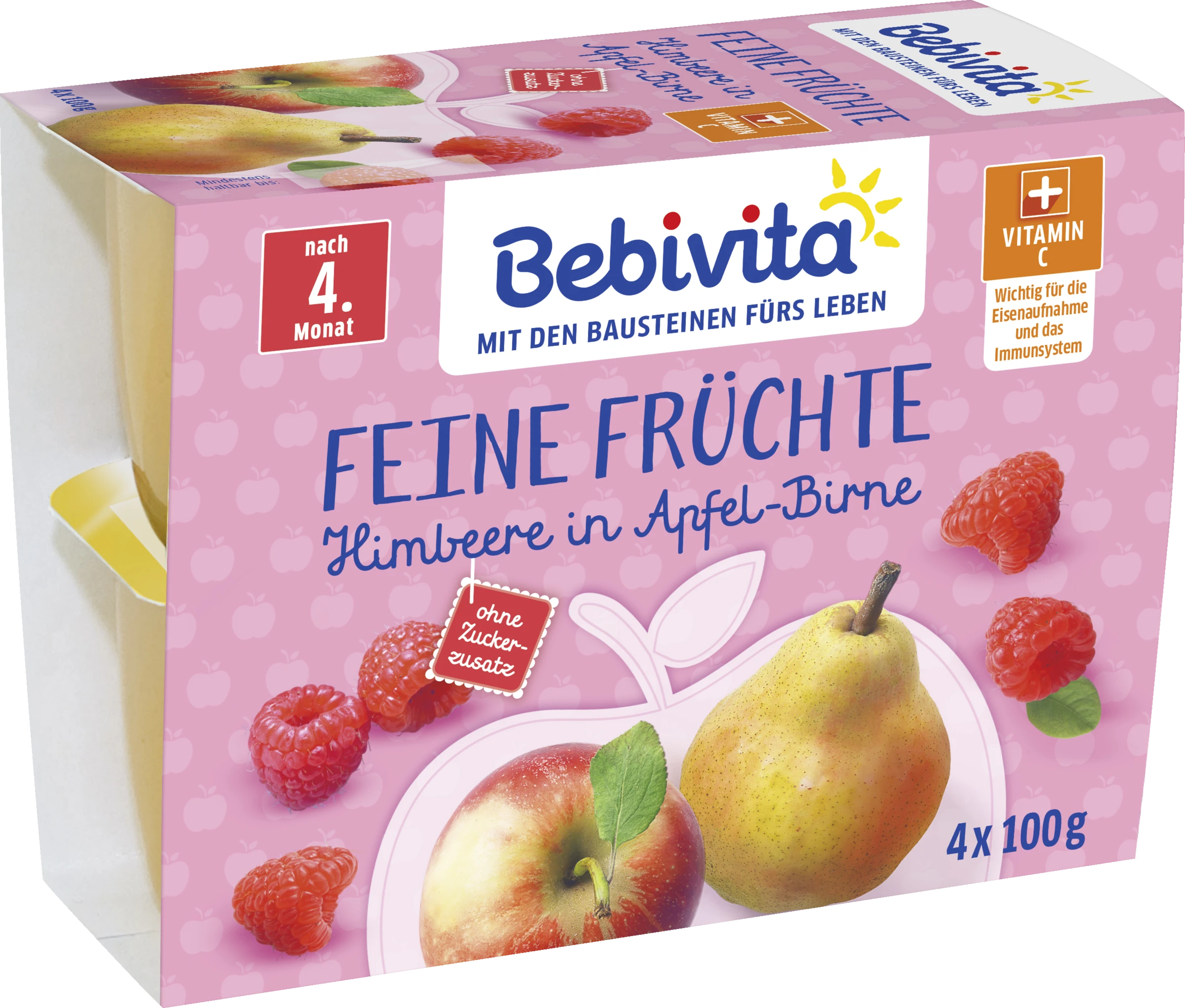 Früchte 100% (Äpfel 85%, Birnen 10%, Himbeeren 5%), Vitamin C. Hinweise: von Natur aus glutenfrei