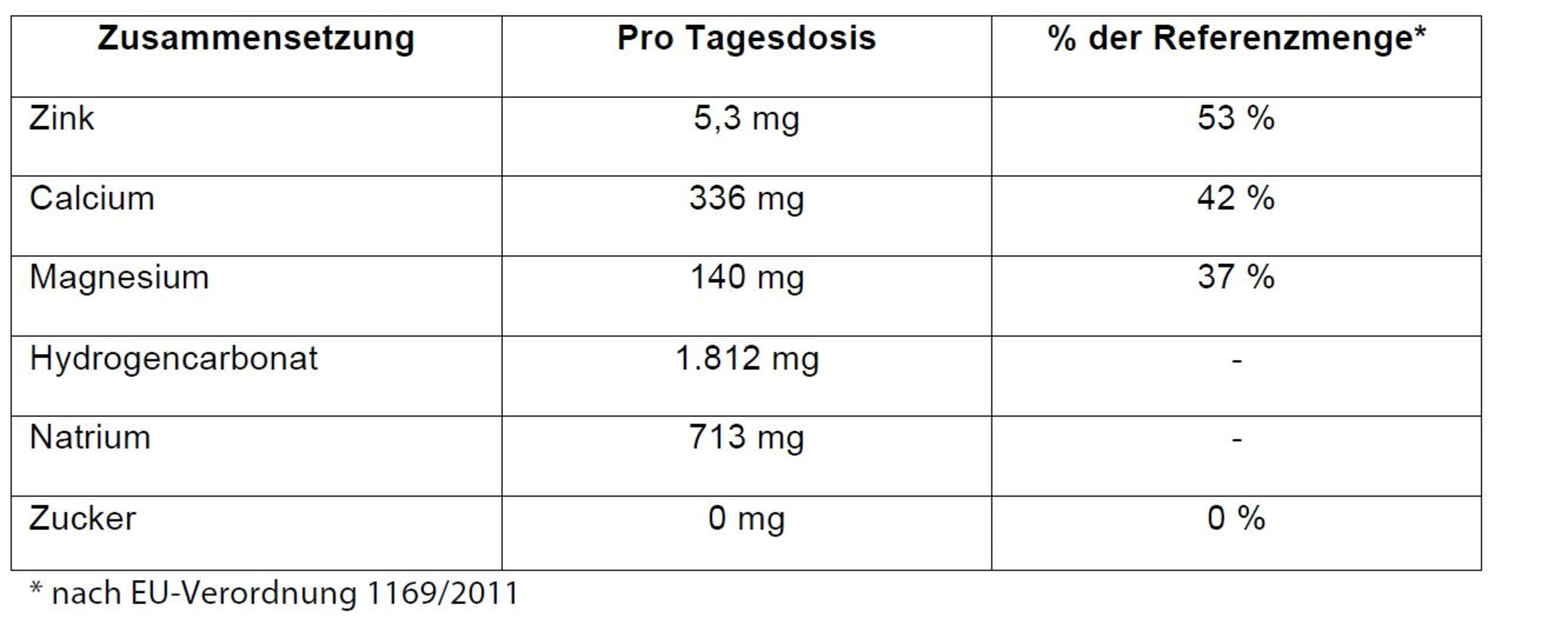 Natriumhydrogencarbonat, Calciumcarbonat, Magnesiumcerbonat, Kartoffelstärke,Trikaliumcitrat, Trennmittel Talkum, Mononatriumphosphat, Füllstoff Zellulose, Zinkgluconat.