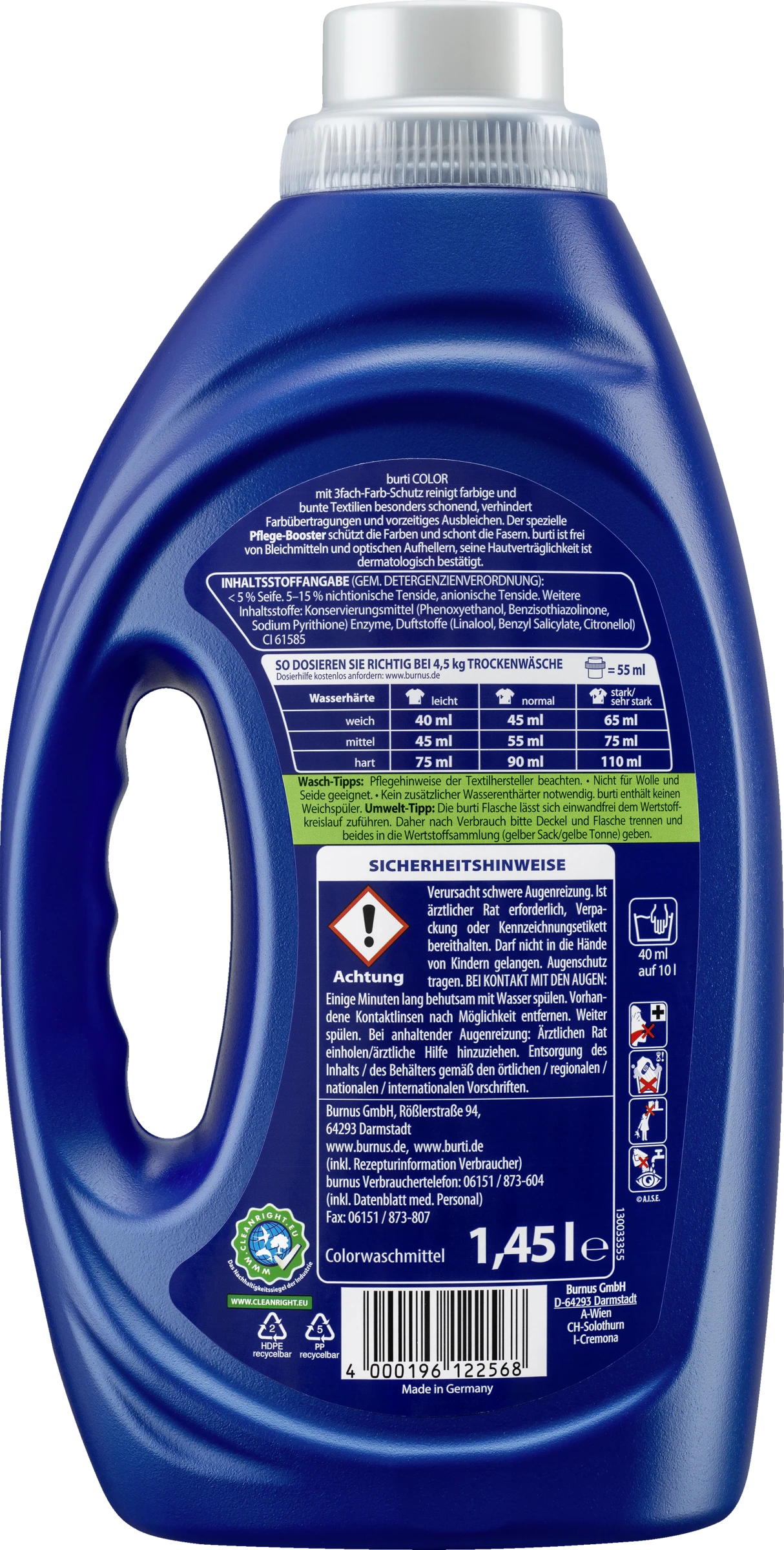 Pflegehinweise der Textilhersteller beachten.Nicht für Wolle und Seide geeignet. Kein zusätzlicher Wasserenthärter notwendig. burti enthält keinen Weichspüler.
