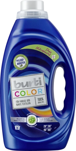 Burti COLOR ist das perfekte, schonende Colorwaschmittel für all Ihre farbigen und bunten Textilien. Eine 7fach-Enzym-Kombination löst behutsam den Schmutz aus den Fasern, ohne das Gewebe zu strapazieren. Der spezielle 3fach-Farb-Schutz verhindert Farbübertragungen, verhindert vorzeitiges Ausbleichen und unterstützt gleichzeitig die Leuchtkraft der Farben.