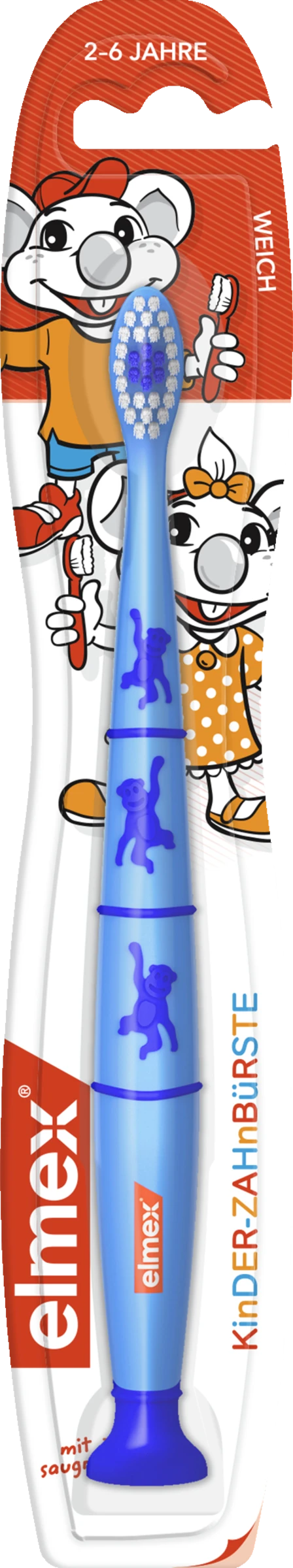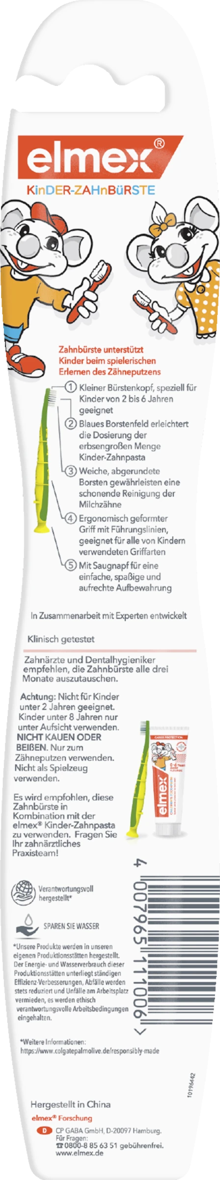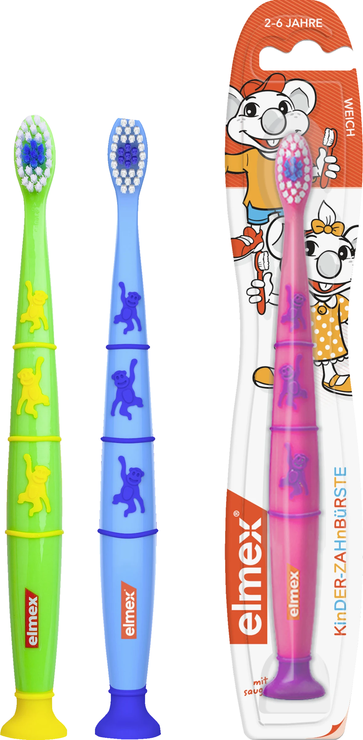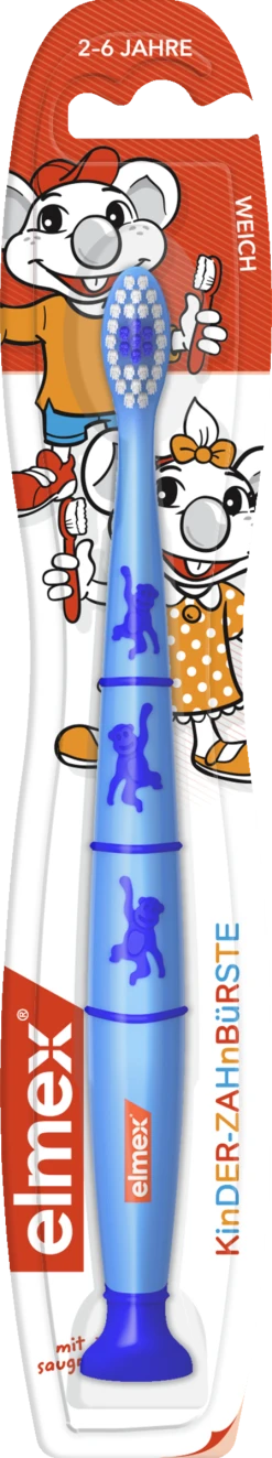 Um die ersten eigenen Putzversuche zu fördern, sollten Sie Ihrem Kind eine auf seine motorischen Fähigkeiten angepasste Zahnbürste geben. Die elmex Kinder-Zahnbürste unterstützt Kinder beim spielerischen Erlernen des Zähneputzens. Kleiner Bürstenkopf speziell angepasst an den Mund von Kindern von 2-6 Jahren. Blaues Borstenfeld erleichtert die Dosierung der erbsengrossen Menge Kinder-Zahnpasta. Weiche, abgerundete Borsten gewährleisten eine schonende Reinigung der Milchzähne. Ergonomisch geformter Griff mit Führungslinien geeignet für alle von Kindern verwendeten Griffarten. Mit Saugnapf für eine einfache, spaßige und aufrechte Aufbewahrung.