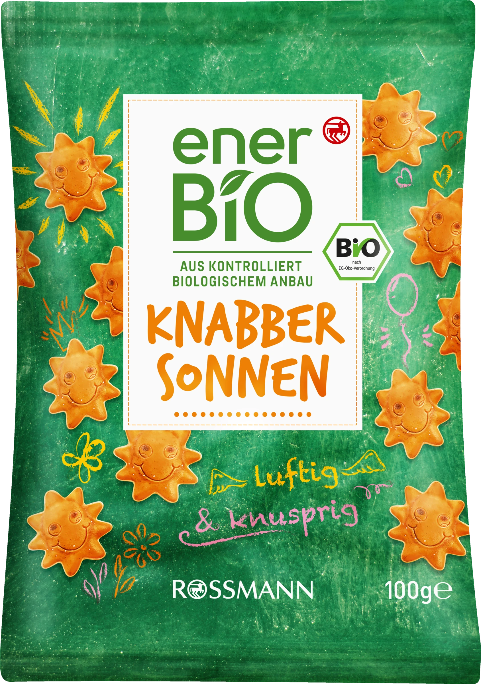 Positive Energie zum Überall-Knabbern. Hier geht bei jedem Biss die Sonne auf: Unsere strahlend goldenen enerBiO Knabbersonnen vertreiben zwar keine Regenwolken, sorgen jedoch für ansteckend gute Laune und stillen mit Ihrem Lächeln und köstlichem Geschmack den kleinen Bio-Snack-Hunger. Sie möchten noch einen Grund zum Strahlen? Unsere Knabbersonnen werden in einem Betrieb mit 100% Ökostrom geboren.