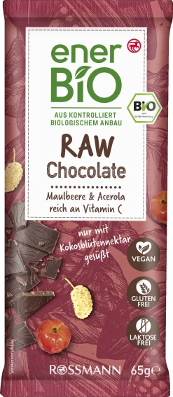 Schokolade ist mehr als nur lecker. Kakao enthält von Natur aus Eisen und Magnesium. Unsere Rohschokolade wird bei niedrigen Temperaturen hergestellt und deutlich weniger bearbeitet als herkömmliche Schokolade. Acerola-Kirsche sorgt für einen hohen Vitamin C-Gehalt. Die RAW Chocolate wird so zu einem wahren Supernaschfood. Hier haben Sie gut Naschen. Da tanzen Ihre Geschmacksnerven vor Freude. Unsere mit Kokosblütenzucker gesüßte Bio RAW Chocolate verwöhnt Sie nicht nur mt vollem Kakao-Aroma, sondern auch mit karamellig schmeckenden Maulbeeren und Noten von feinsäuerlichen Acerola-Kirschen.Alle Produkte unserer ROSSMANN-Marke enerBiO stammen aus kontrolliert biologischem Anbau. Durch eine schonende, sorgfältige Verarbeitung erhalten wir hierbei sowohl die Hochwertigkeit als auch den natürlichen Geschmack. Zudem lassen wir unsere Produkte regelmäßig durch unabhängige Institute überprüfen – so gewährleisten wir eine gleichbleibende Qualität.