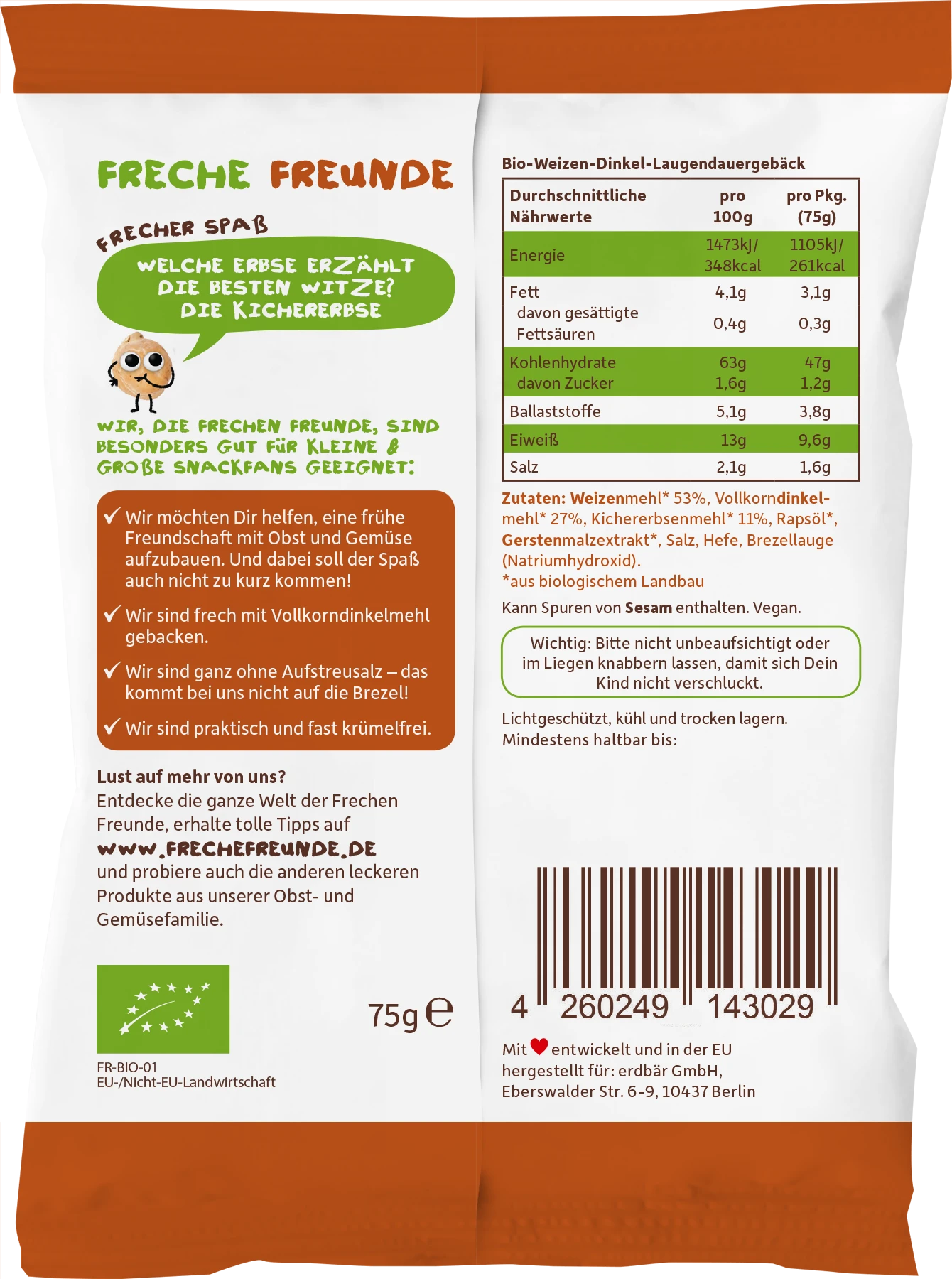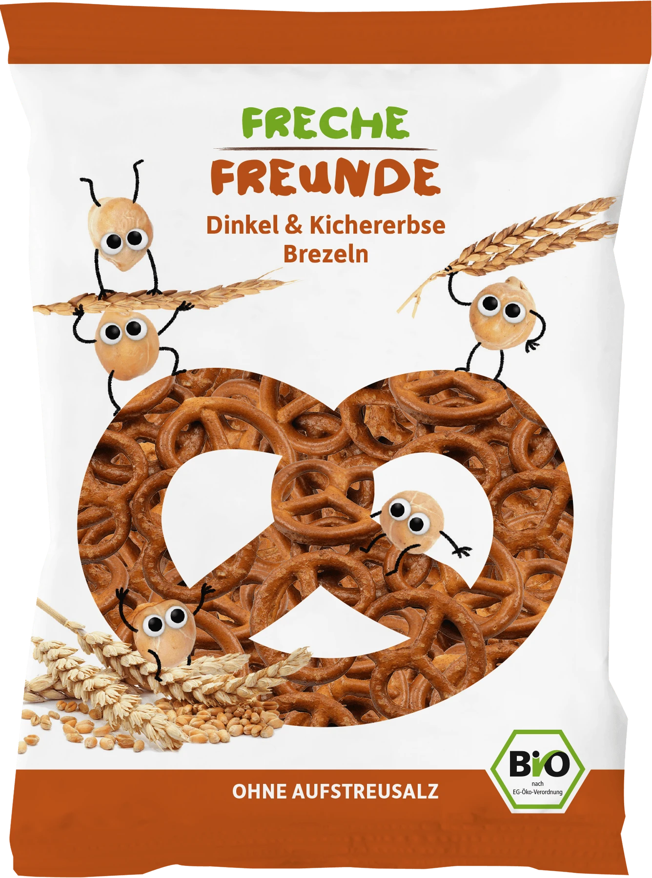 Kinder Knabberzeug in Brezelform – ohne Aufstreusalz. In geprüfter Bio-Qualität für alle kleinen und großen Snackfans. Der freche Knabberspaß besteht aus Weizen, Dinkel, Kichererbsenmehl, Gerstenmalz und Hefe, enthält nur einen geringen Anteil Salz. Kleiner Knabberspaß für unterwegs.