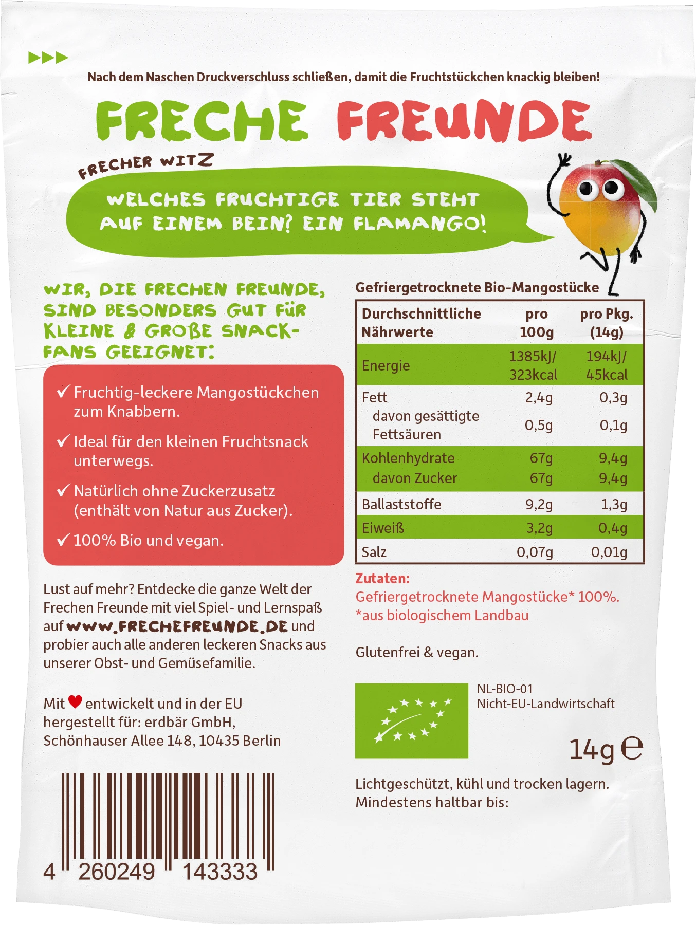 Gefriergetrocknete Früchte in Bio-Qualität. Die Obst Chips Mango sind schonend gefriergetrocknet und daher ein knackiger Kinder Snack für zwischendurch. Die kleinen Fruchtstückchen sind in geprüfter Bioqualität, enthalten nur fruchteigenen Zucker und keine weiteren Zusätze. Dieser vegane Snack ist gluten- und laktosefrei. Eignet sich auch als Topping für Joghurt oder Müsli.