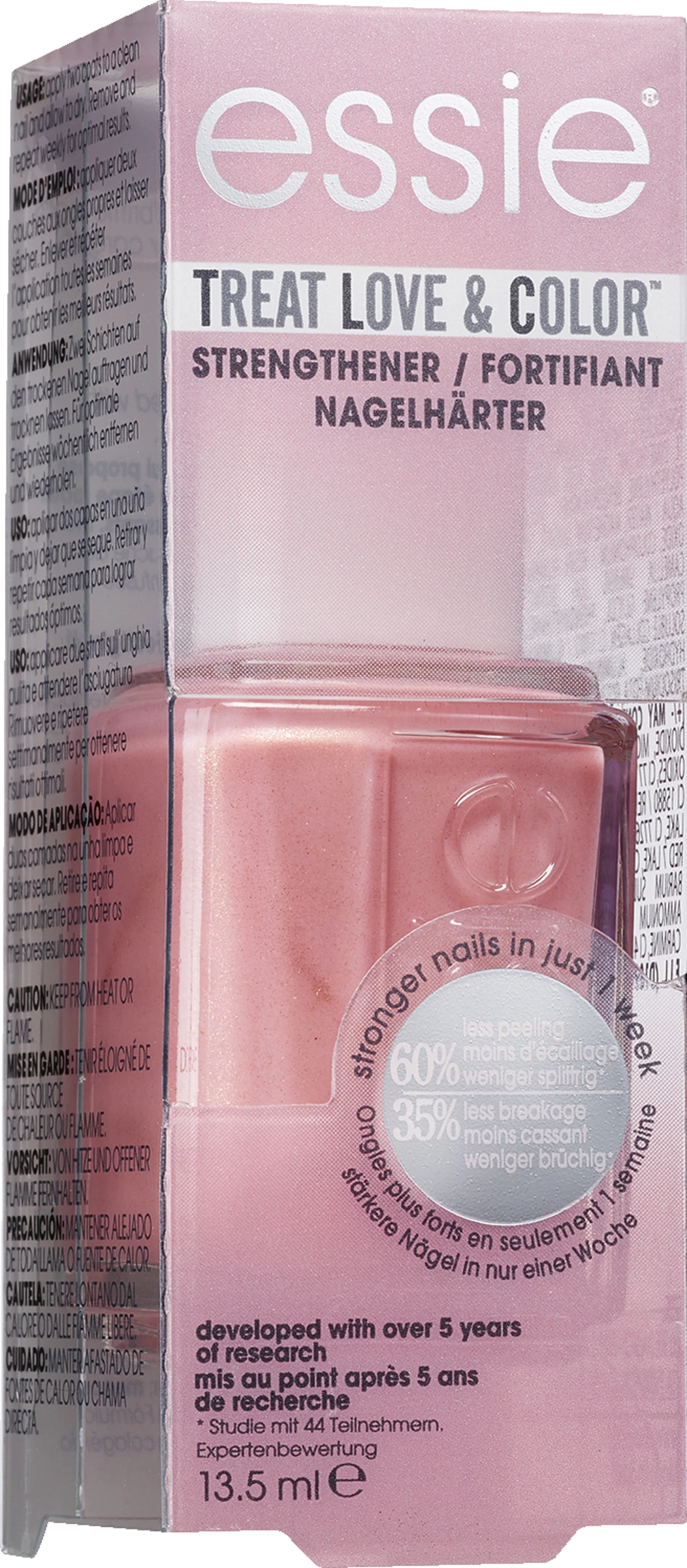 Mit Treat, Love & Color stärken Sie Ihre Nägel sofort und nachhaltig. Die Formel mit optisch aufhellenden Pigmenten kaschiert Unebenheiten schon beim Auftragen und schenkt den Nägeln hauchzarte, glänzende Farbe. Dank Kollagen und Kamelien-Extrakt werden sie innerhalb einer Woche regeneriert. So müssen Sie bei der Nagelpflege nicht auf Farbe verzichten.