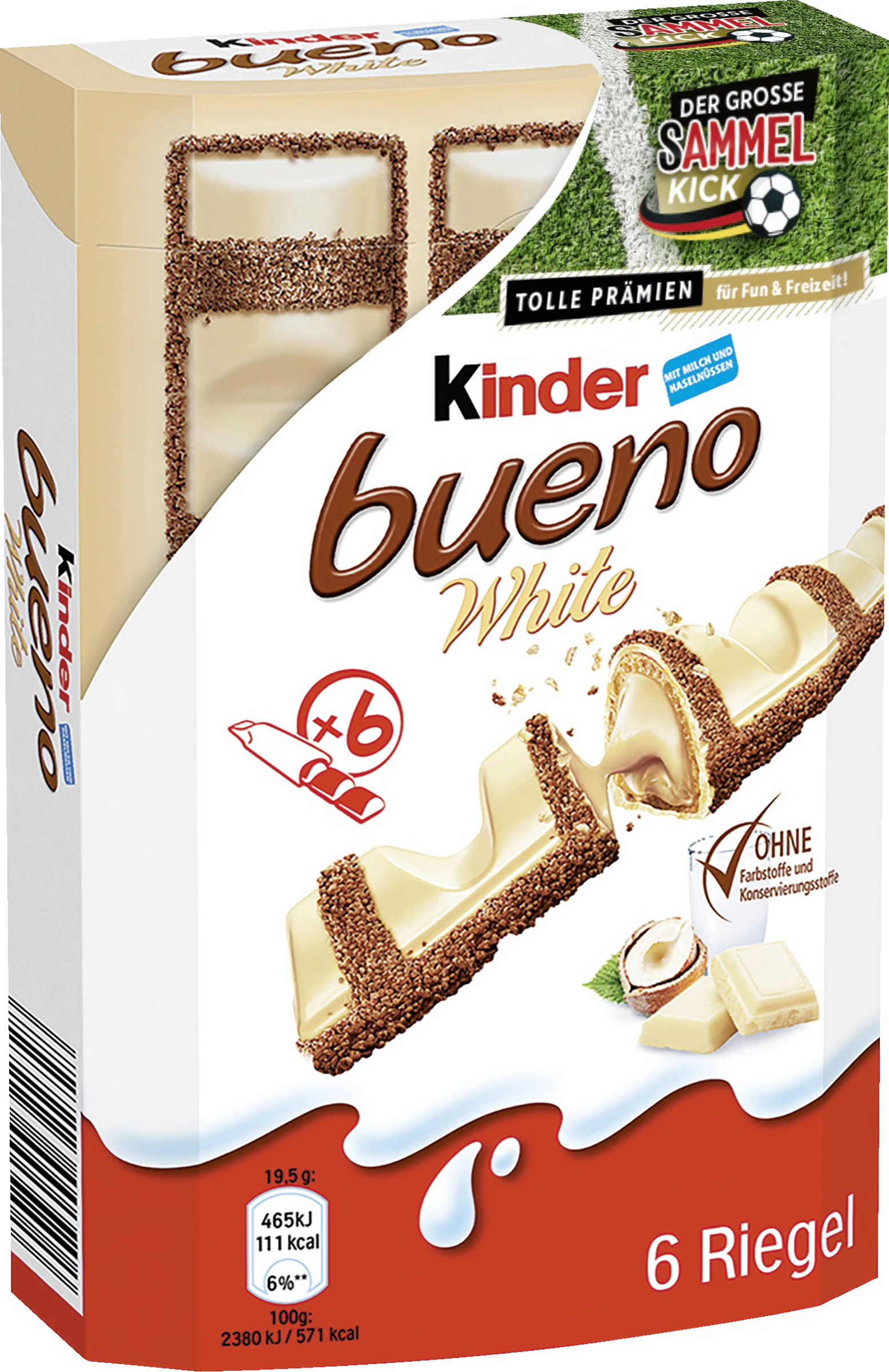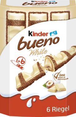 Die Sonder-Edition kinder bueno White ist wunderbar knusprig und cremig zugleich – der Riegel für wahre Genießer. Das besondere an diesem Naschwerk ist die zarte Knusperhülle, die mit köstlicher weißer Schokolade überzogen und mit Knusper-Kakao dekoriert sind. Die cremige Füllung aus Milch und Haselnüssen versüßt Ihnen auf ganz besondere Weise den Moment.