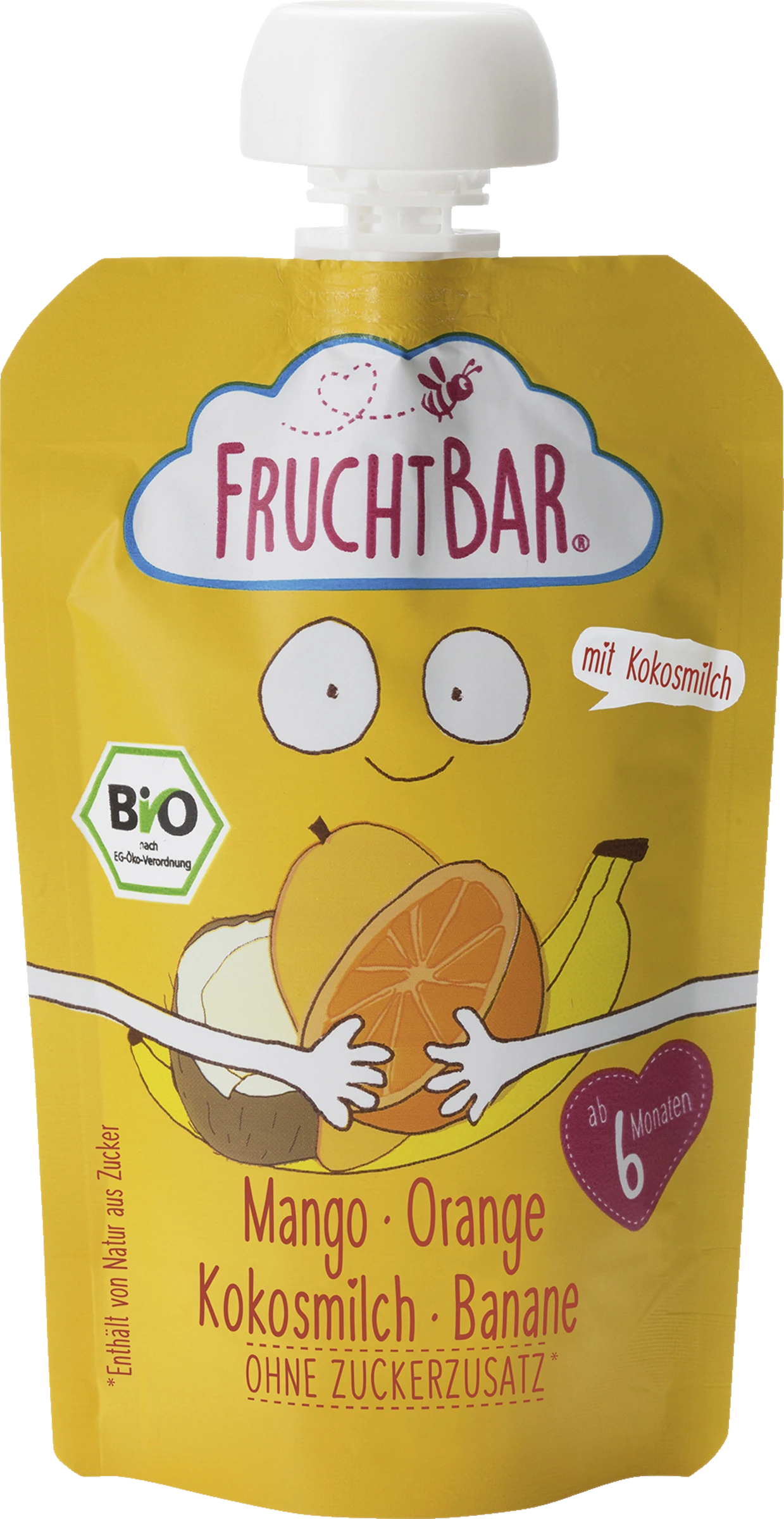pürierte Banane* (65%), Orangensaft* (18%), pürierte Mango* (10%), Kokosmilch* (Kokosnussextrakt*, Wasser) (7%), Zitronensaftkonzentrat*.