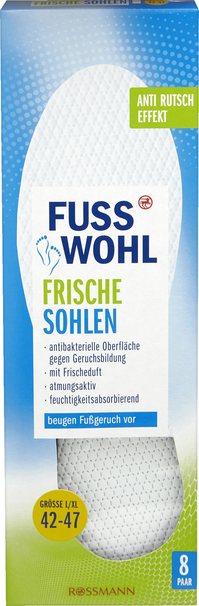 Die ultradünnen, atmungsaktiven FUSSWOHL FRISCHESOHLEN mit Mikroduftkapseln verleihen hygienische Fußfrische bis zu 7 Tage.
