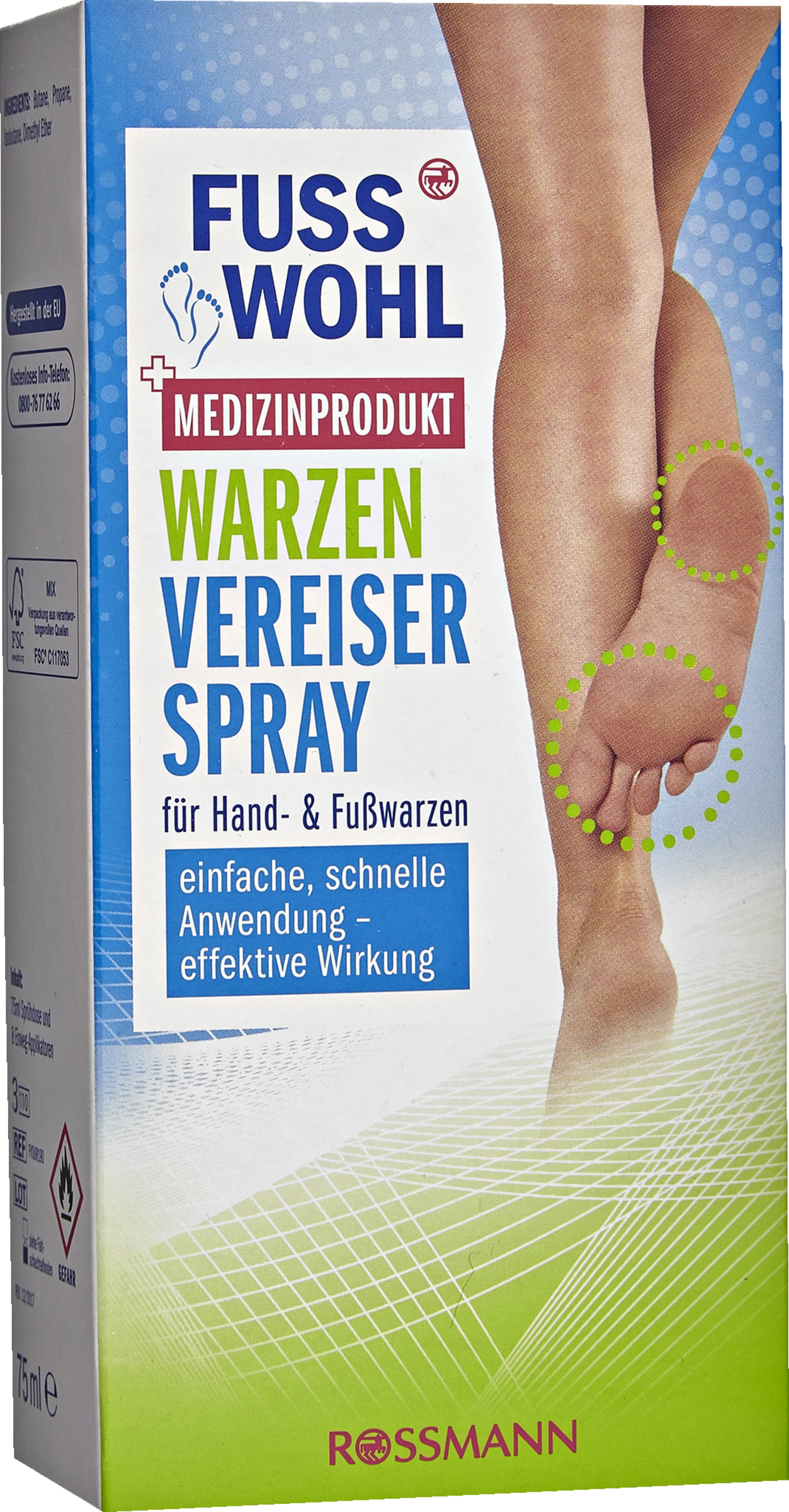 Das FUSSWOHL WARZENVEREISERSPRAY wurde entwickelt, um Dornwarzen sowie gewöhnliche Warzen durch Kryotherapie zu entfernen. Dornwarzen, auch Plantarwarzen genannt, sind Warzen, die sich an den Belastungsstellen des Fußes, unterhalb des Fußgewölbes, entwickeln. Sie können sehr hart und druckschmerzhaft sein. Die gewöhnlichen Warzen entwickeln sich hingegen im Bereich von Händen, Knien und Gesicht. Warzen sind Ergebnis einer Hautwucherung, die in Form eines Hautauswuchses erscheint. Sie sind unästhetisch und werden durch direkte Berührung übertragen. Durch die Kryotherapie werden Warzen mittels extremer Kälte bis zu -50°C behandelt und entfernt. Hierdurch werden eine Vereisung und Ablösung der Warzen verursacht. Das Warzenvereiserspray beinhaltet 8 Applikatoren. Es ist wirksam und einfach inder Anwendung.