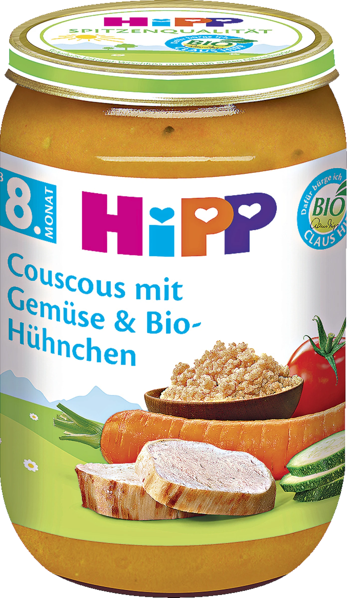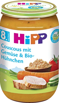HiPP Couscous mit Gemüse und Bio-Hühnchen, eine vollwertige Mahlzeit ab dem 8. Monat.