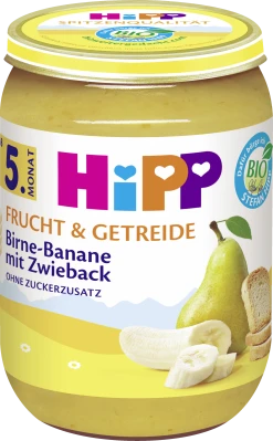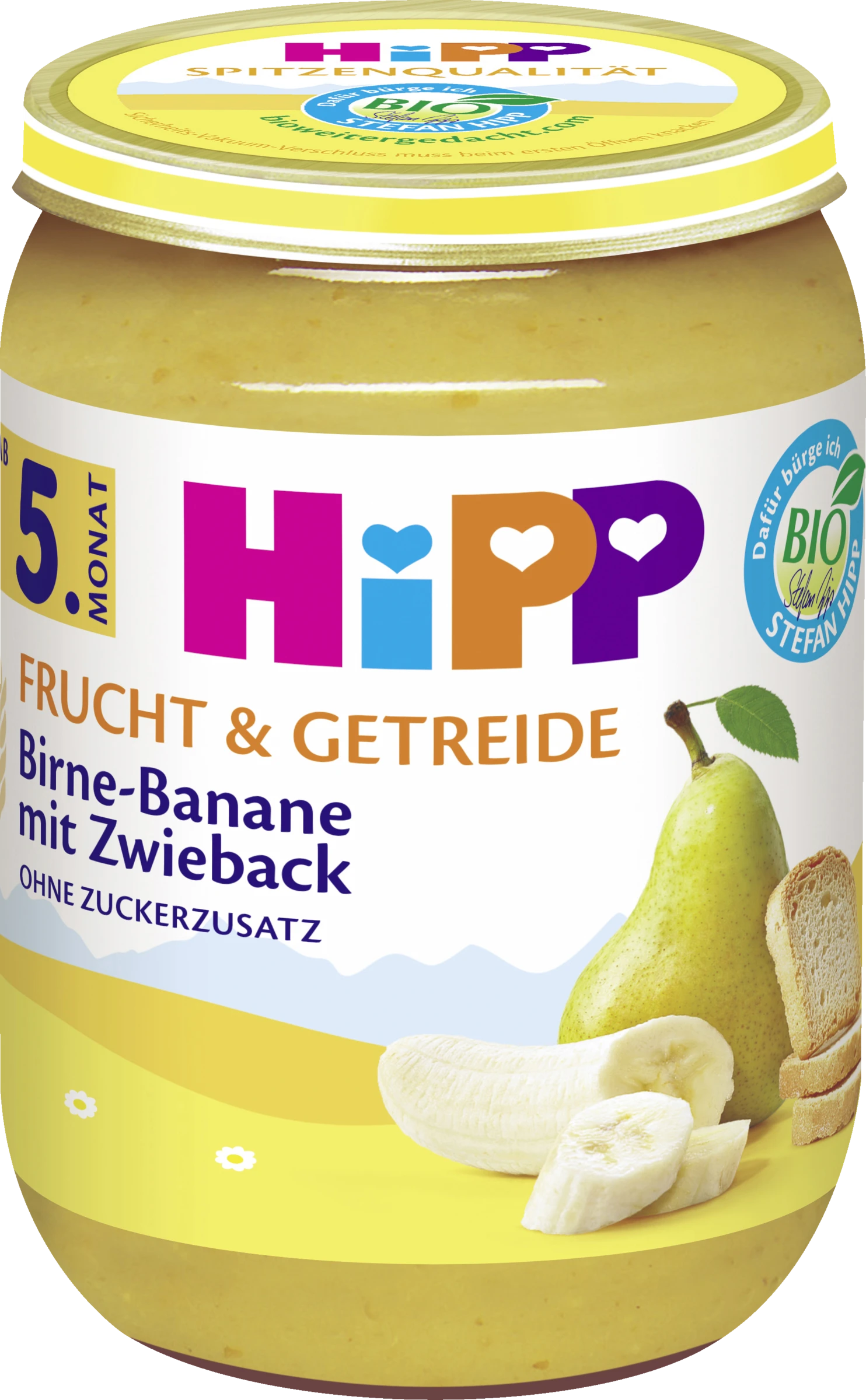 Das Gläschen Birne-Banane mit Zwieback besteht aus speziellen Obstsorten, die genügend Zeit zum Reifen hatten und so ganz natürlich ihren vollen Fruchtgeschmack entwickeln konnten. Der Zweiback besteht aus Mehrkorn-Getreide und wurde speziell für Babys Bedürfnisse abgestimmt.