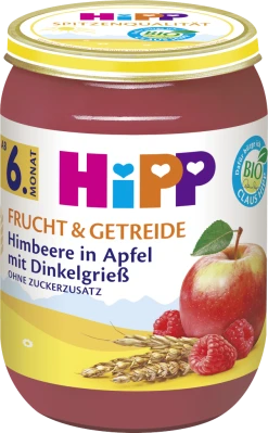 Früchte* 90% (Äpfel* 60%, säurearmer Apfelsaft* aus Apfelsaftkonzentrat 25%, Himbeeren* 5%), DINKELGRIESS* 5%, Stärke*, Karottensaftkonzentrat*, Antioxidationsmittel Ascorbinsäure.*aus biologischer ErzeugungHinweis: GLUTENHALTIG.