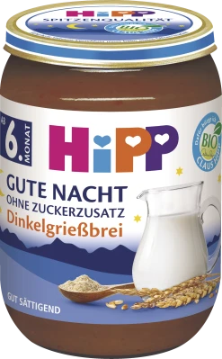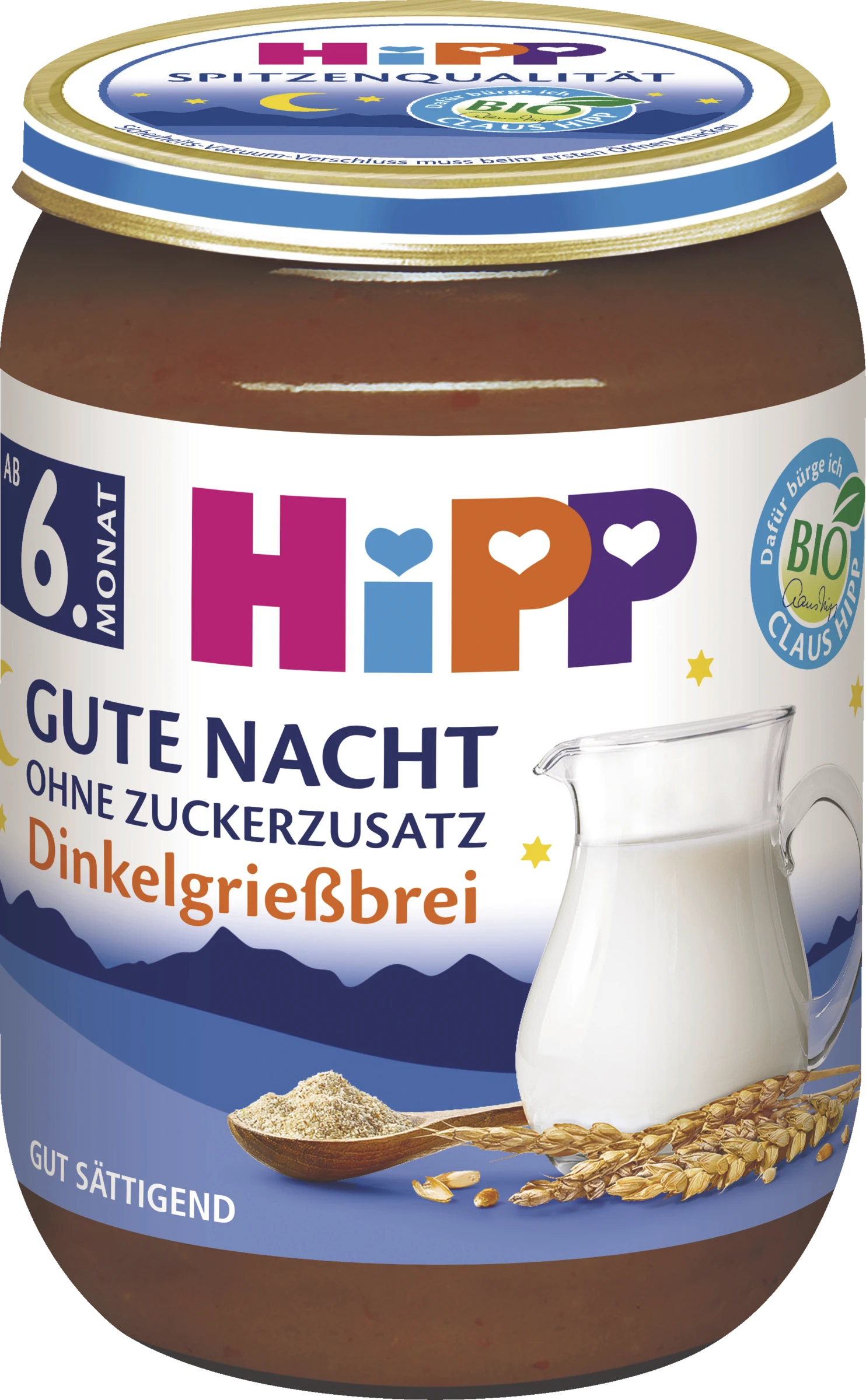 HiPP Gute Nacht Breie sind ohne Zuckerzusatz und gut sättigend. Sie enthalten Calcium, Vitamin A, Vitamin D und Vitamin B1. Die Neue Sorte HiPP Gute Nacht Dinkelgrieß in bewährter HiPP Bio Qualität ist eine vollwertige Abendmahlzeit. Dinkel ist ein Urgetreide, das für dieses neue Gläschen zu einem feinen Grieß vermahlen wird.