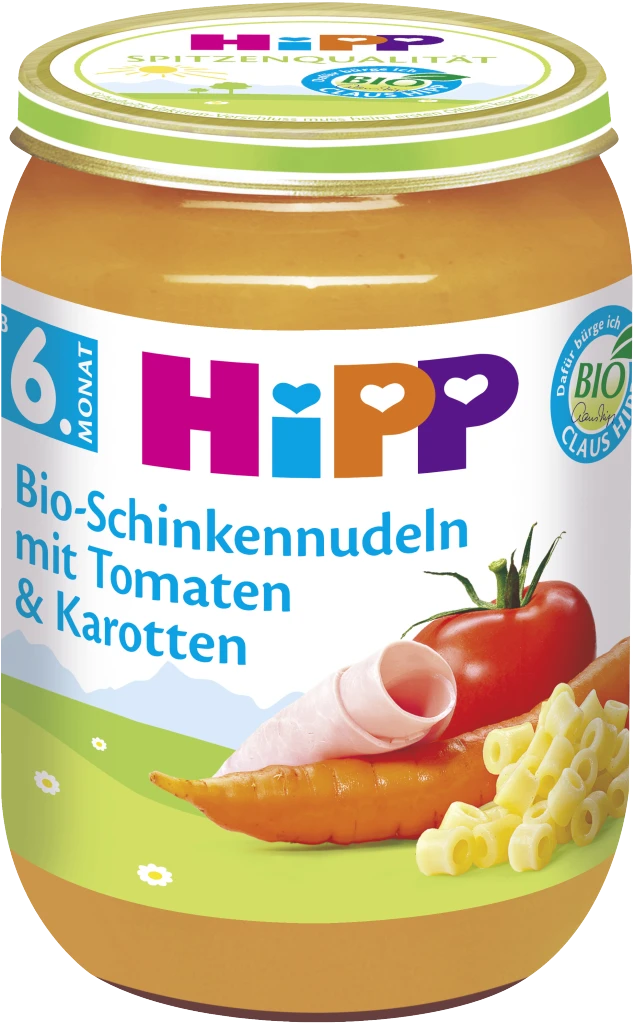 Gemüse* 59% (Karotten* 30%, Tomaten* 29%), Nudeln* vermahlengekocht 27% (HARTWEIZEN), Hinter- und Vorderschinken* ungepökelt8,6%, Zwiebeln*, Rapsöl* 0,9%, Gewürz*. *Aus biologischer Erzeugung.Nudeln können Spuren von EI enthalten.