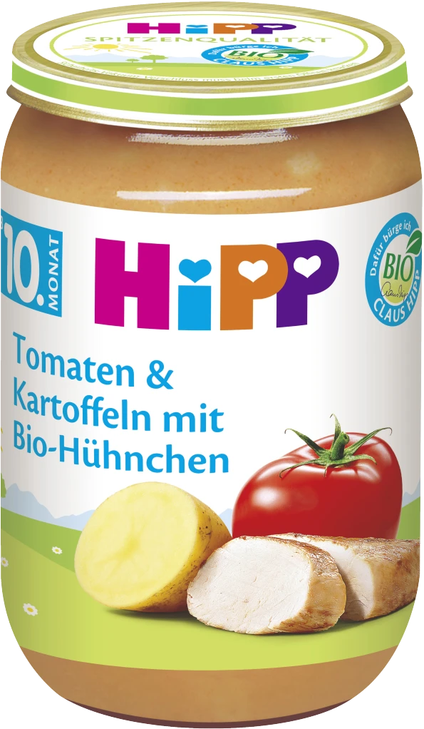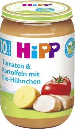 Gemüse* 53% (Kartoffeln* 26%, Tomaten* 25%, Zwiebeln*), Wasser, Hühnerfleisch* 9,4%, Maismehl*, Stärke*, Rapsöl* 1,9%, Gewürze*.Glutenfrei.*aus biologischer Erzeugung.
