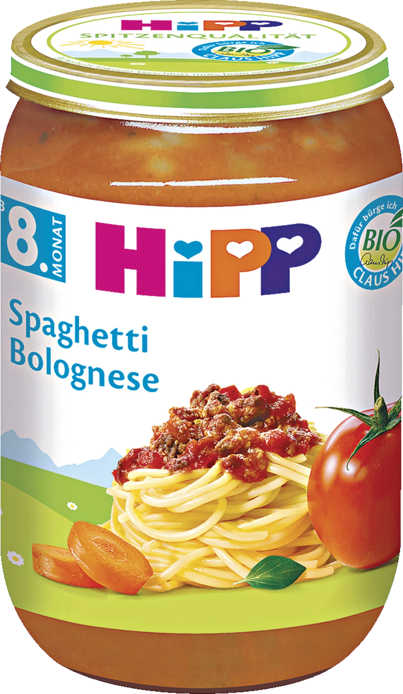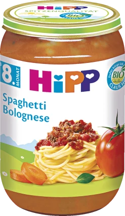 HiPP Spaghetti Bolognese, eine vollwertige Mahlzeit ab dem 8. Monat.