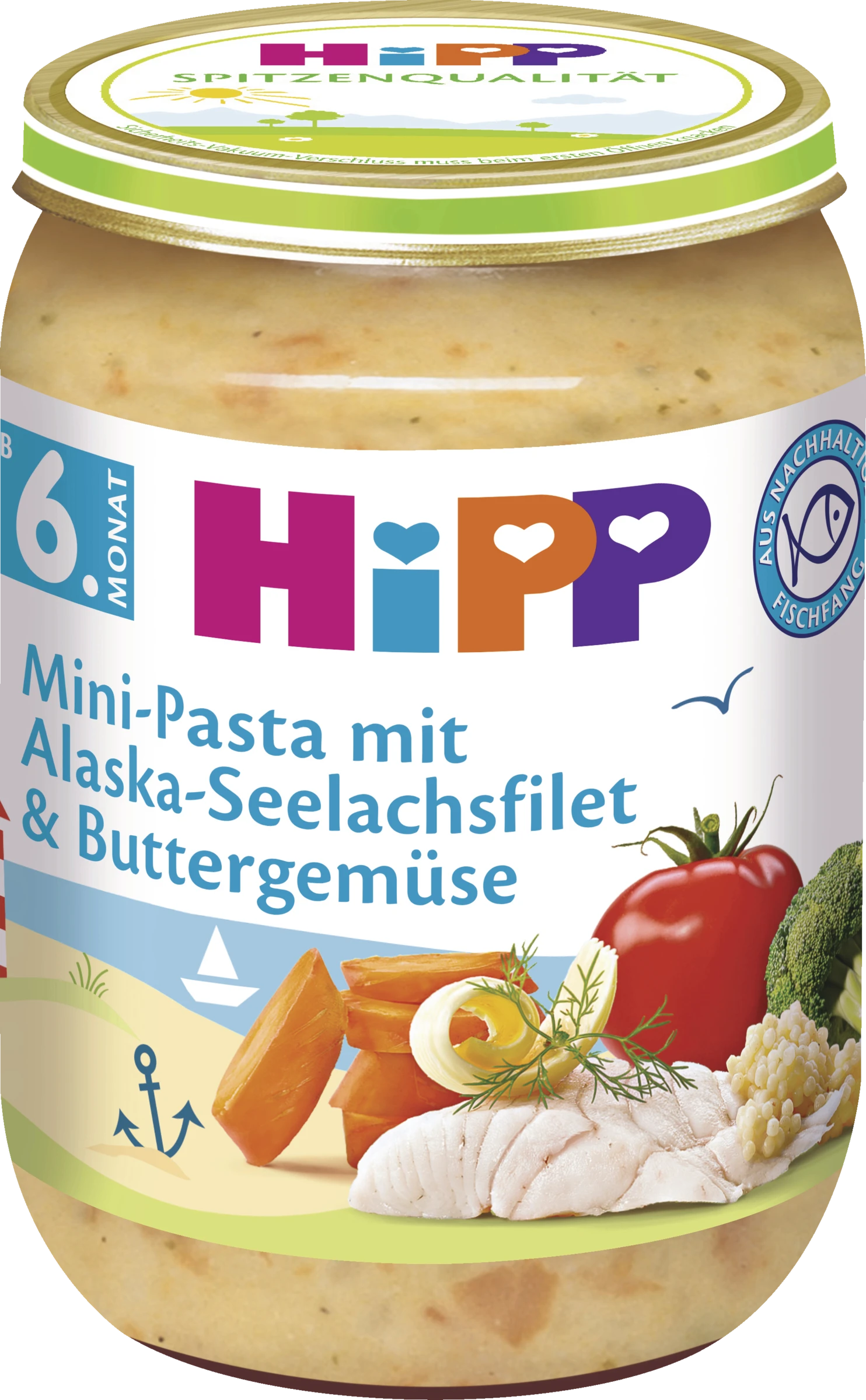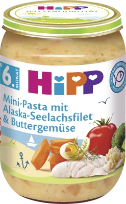 HiPP Mini-Pasta mit Alaska-Seelachsfilet und Buttergemüse, eine vollwertige Mahlzeit ab dem 6. Monat.