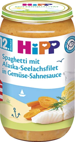 HiPP Spaghetti mit Alaska-Seelachsfilet in Gemüse-Sahnesauce, eine vollwertige Mahlzeit ab dem 12. Monat.