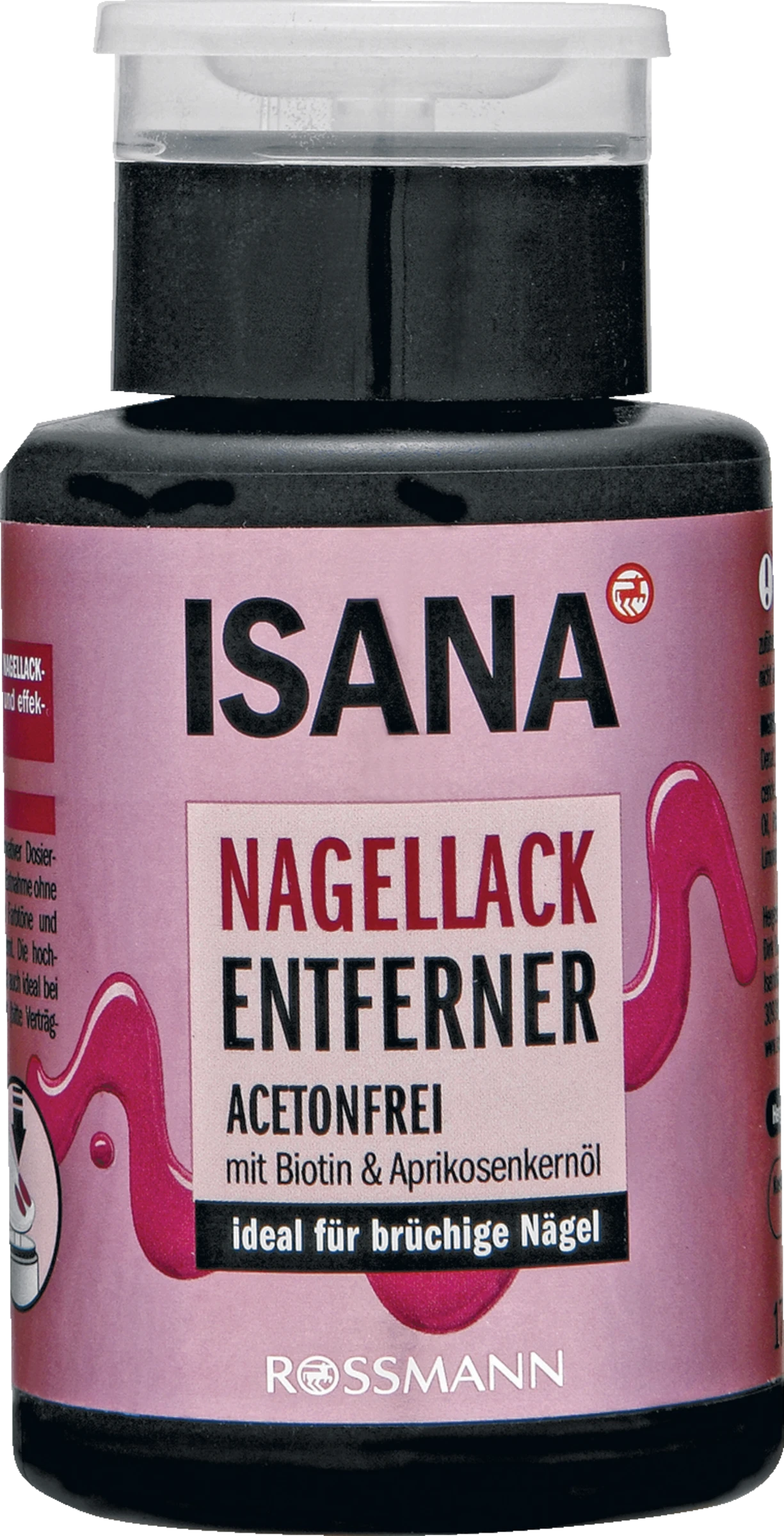 ISANA NAGELLACKENTFERNER mit innovativer Dosierpumpe ermöglicht eine komfortable und sparsame Entnahme ohne Verschütten oder Verspritzen. Dunkle, intensive Farbtöne und Effektlacke werden zuverlässig und schnell entfernt. Die hochwertige Rezeptur mit Biotin und Aprikosenkernöl ist auch ideal bei brüchigen Nägeln. Auch für Kunstnägel geeignet (bitte Verträglichkeit zuvor an kleiner Stelle testen).
