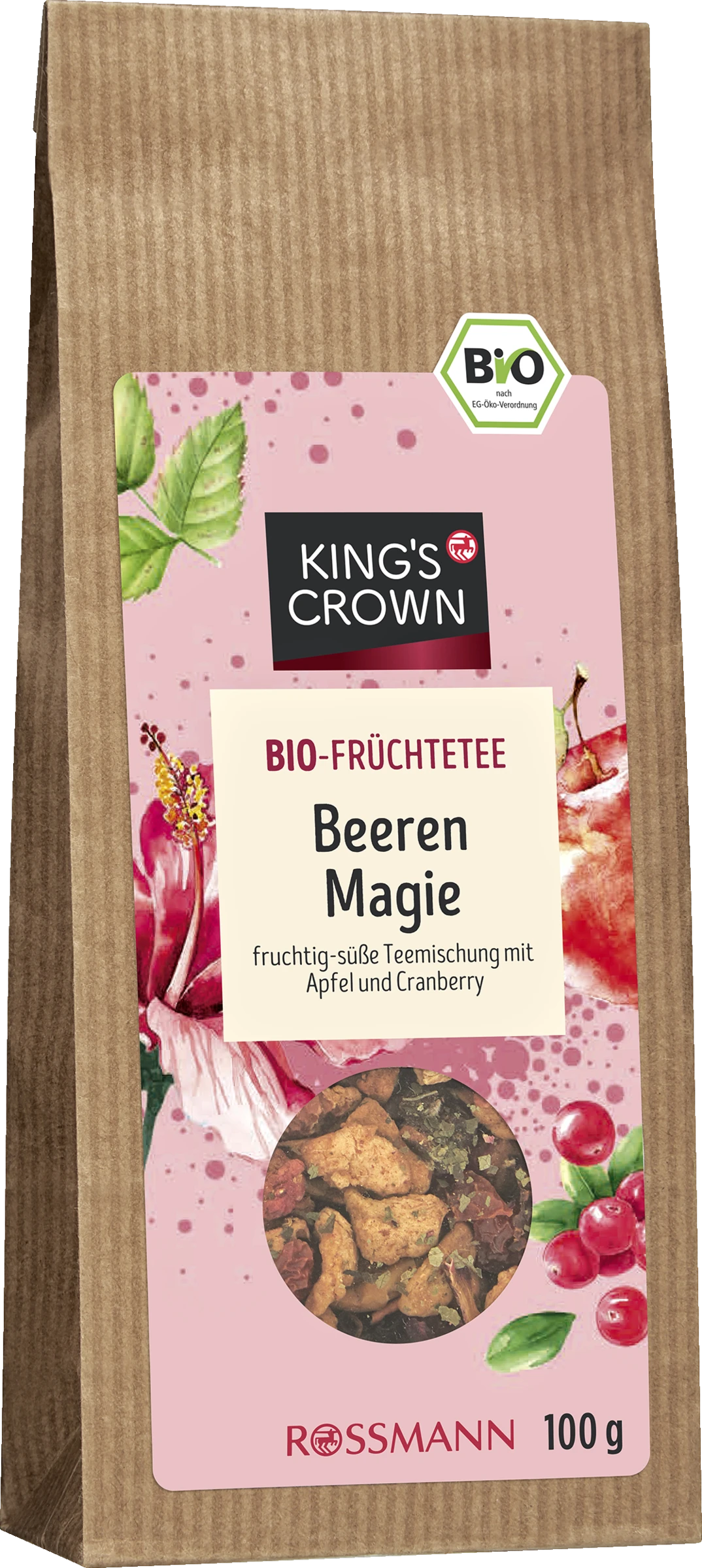 57 % Apfelstücke*, 15 % Hibiskus*, Hagebuttenschalen*, 10 % Cranberrystücke*, 5 % Brombeerblätter*, 1 % gefriergetrocknete Erdbeeren*.