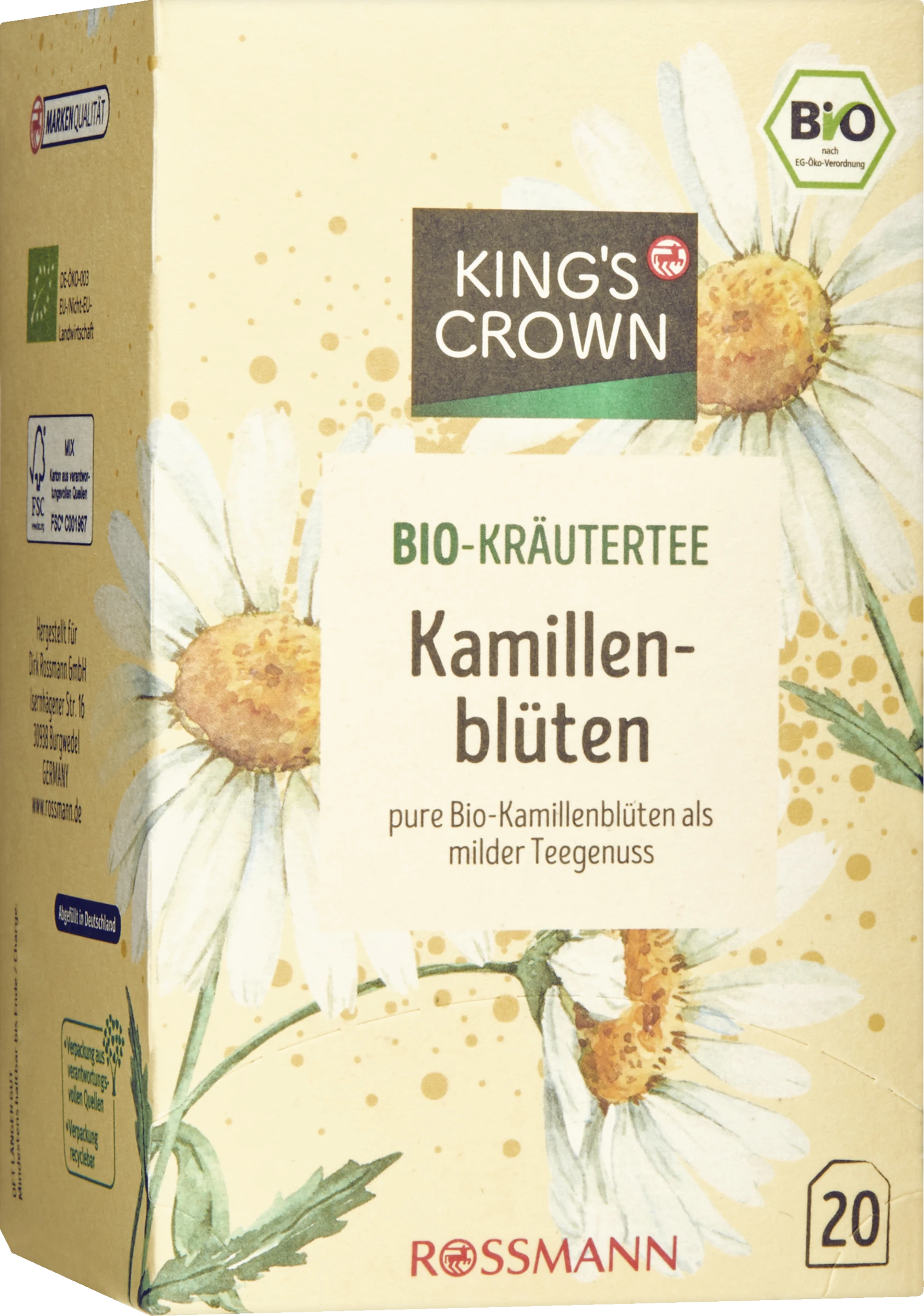 Feine Kamillenblüten lassen einen lieblich-milden Teegenuss entstehen. Der heiße, goldgelbe Aufguss lässt die typischen aromatischen Duftnoten wärmend aufsteigen. Dieser King´s Crwon Kamillenblütentee wurde ohne Zusatz von Aromen, Ölen oder künstlichen Zusätzen hergestellt.
