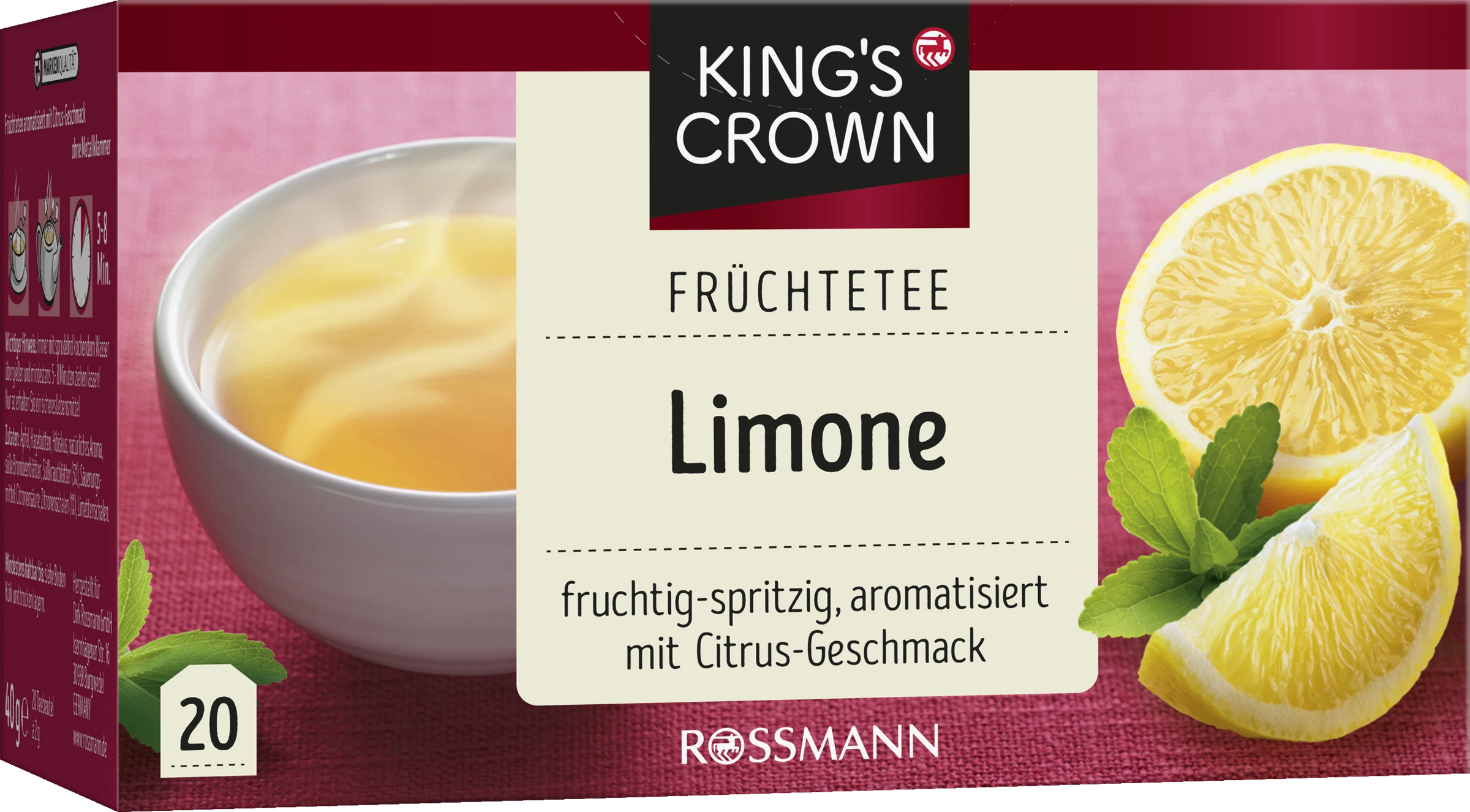Äpfel, Hagebutten, Hibiskus, natürliches Aroma, süße Brombeerblätter, Süßkrautblätter (5%), Säuerungsmittel: Citronensäure; Zitronenschalen (1%), Limettenschalen.
