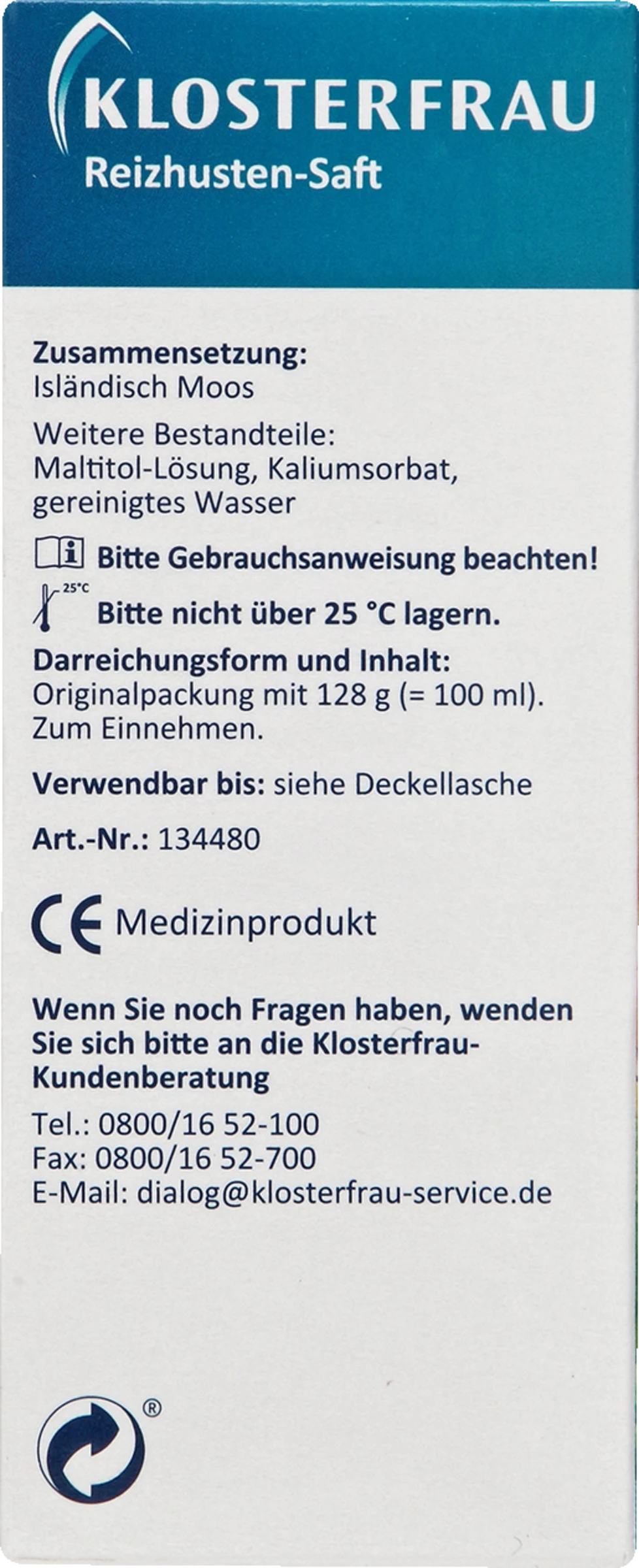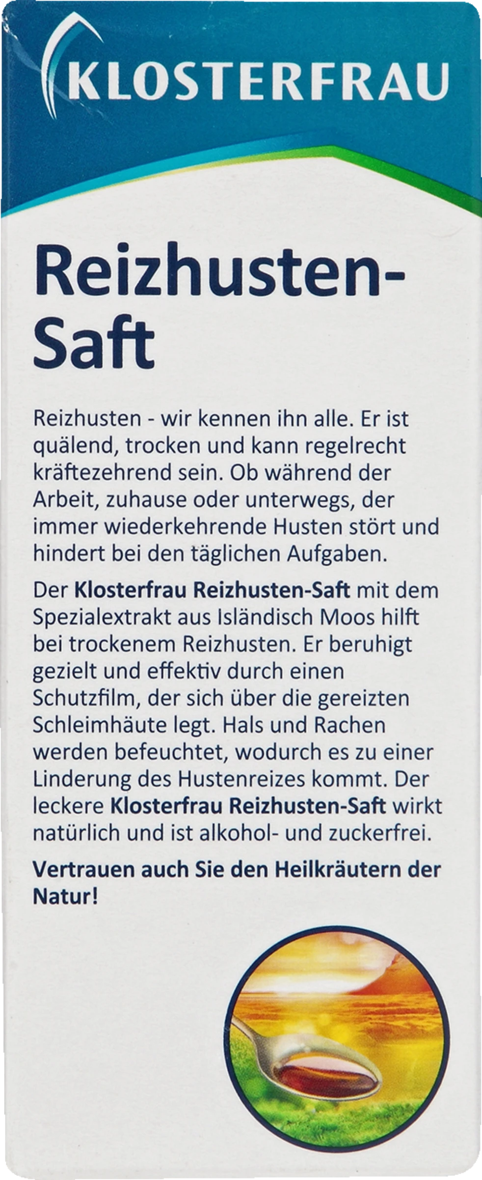 Der wohlschmeckende Klosterfrau Reizhusten-Saft mit dem Spezialextrakt aus Isländisch Moos wirkt gezielt bei trockenem Reizhusten und lindert lästige Hustenanfälle. Auch für Kinder ab 2 Jahren geeignet.