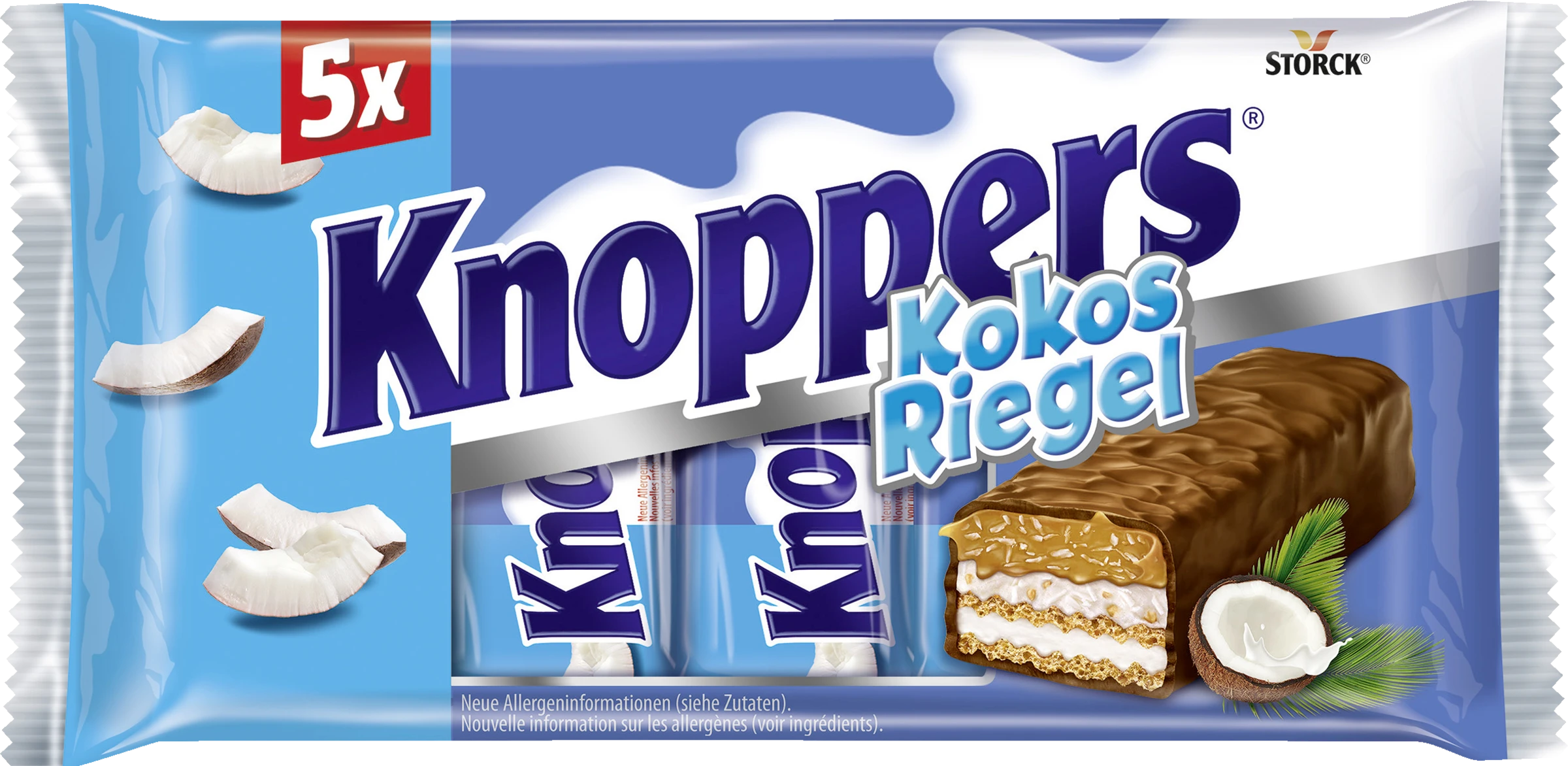Waffelriegel mit Milchcreme (14,4%), Kokoscreme verfeinert mit Haselnüssen (17%), Kokosraspeln (6,5%) und zartem Karamell (26,1%), umhüllt von Vollmilchschokolade (29,5%)