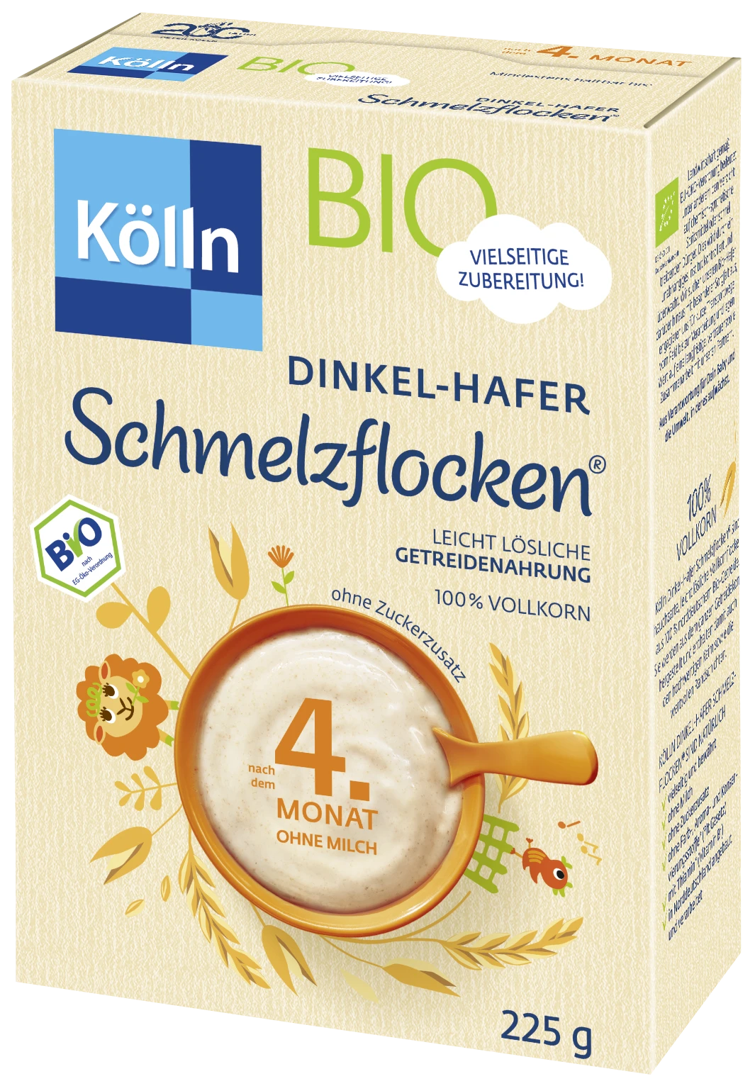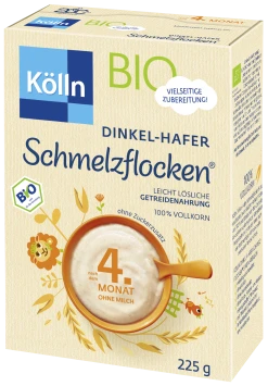 Verwendung für Kinder nach dem 4. Monat empfohlen.Kölln Schmelzflocken® Dinkel-Hafer sind hauchzarte, leicht lösliche Vollkornflocken aus Dinkel und Hafer. Für die Herstellung verwenden wir ausschließlich Dinkel und Hafer aus ökologischem Anbau.
