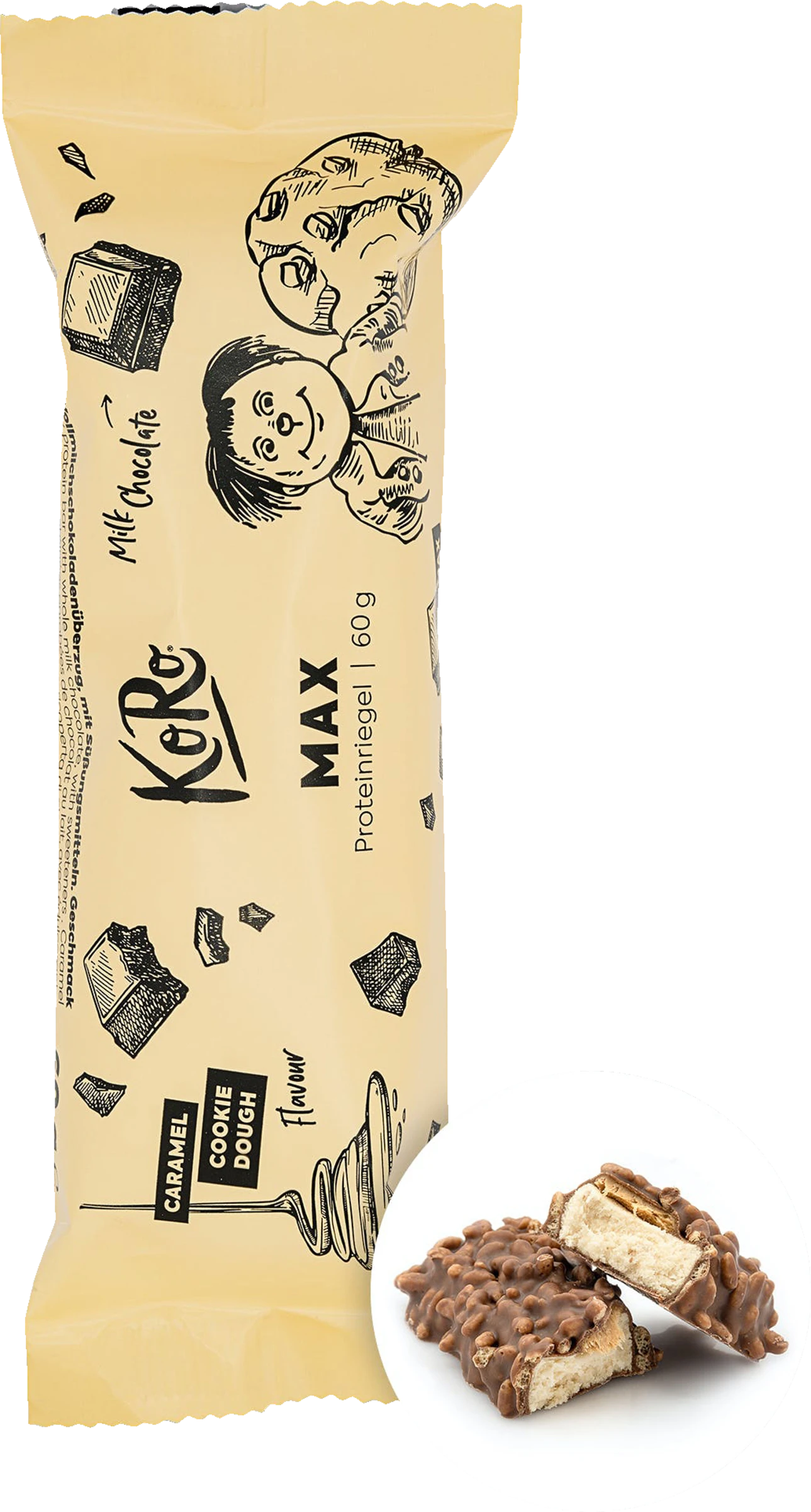 Mit dem Max Protein Bar präsentiert KoRo einen Eiweißriegel der Extraklasse: Statt nach mehligem Proteinpulver schmeckend, überzeugt der Riegel durch einen besonders cremigen Kern mit Karamell-Keksteig-Geschmack, umhüllt von knackiger Vollmilchschokolade. Dazu kommen auf einen Riegel ganze 19 g Protein. Damit ist er eine tolle Unterstützung beim Erreichen des täglichen Proteinbedarfs und perfekt nach dem Workout.