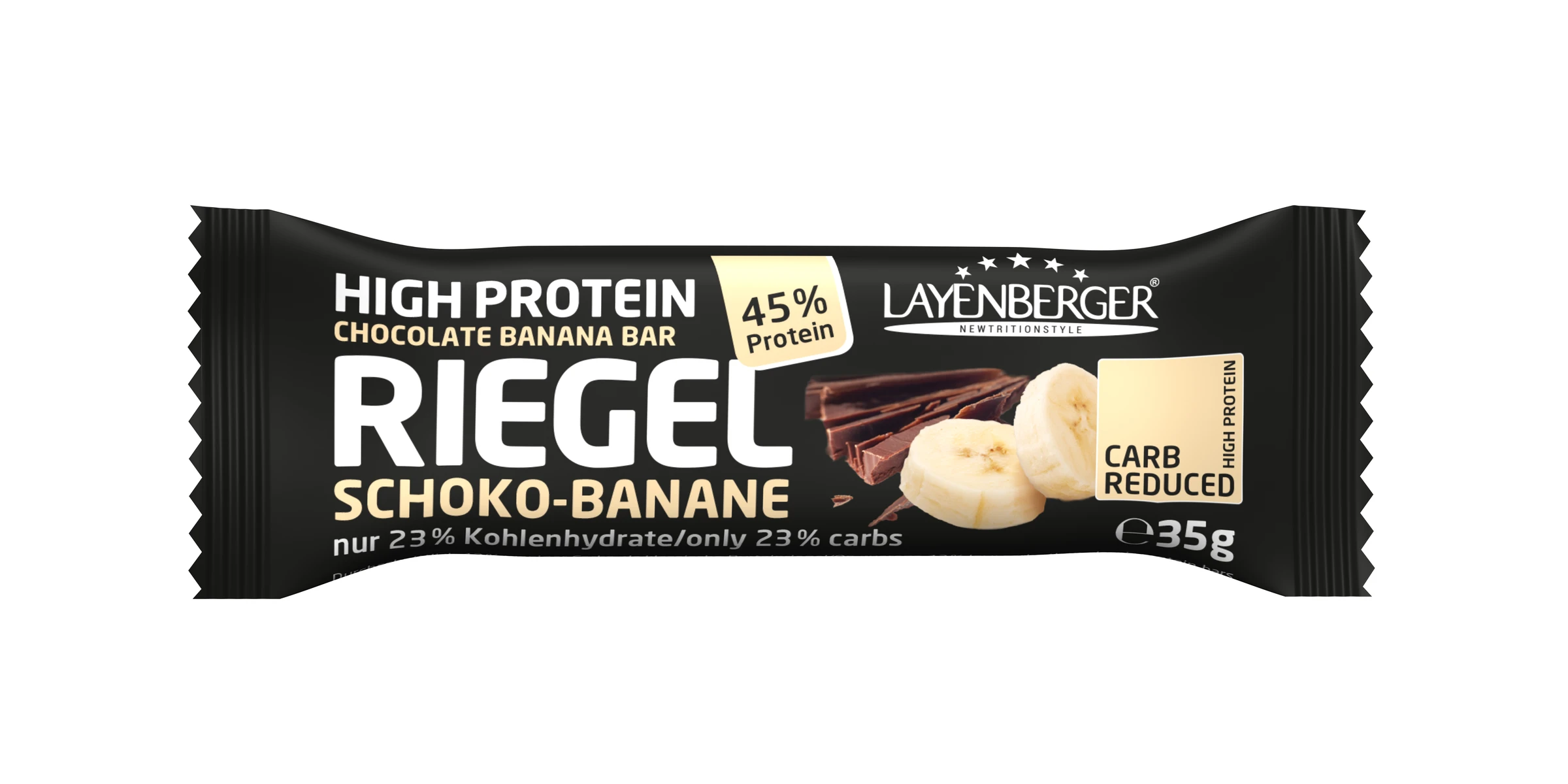 Proteinriegel mit 20% Zartbitter-Schokoladenüberzug. Mit Süßungsmitteln. Bananen-Geschmack.