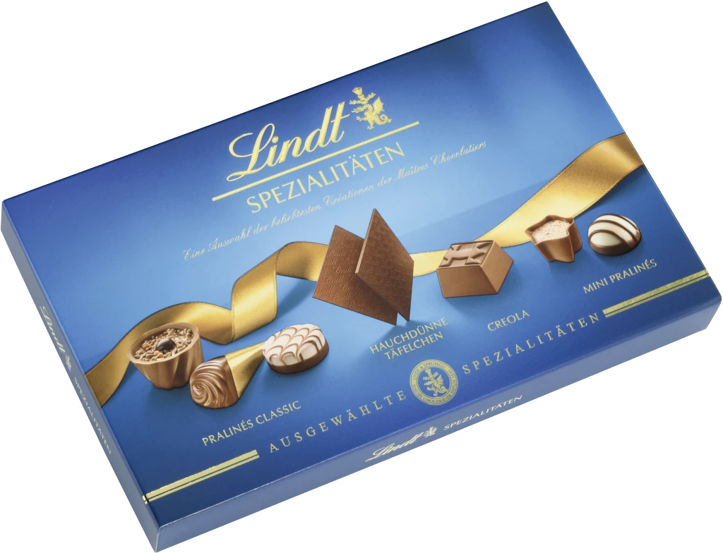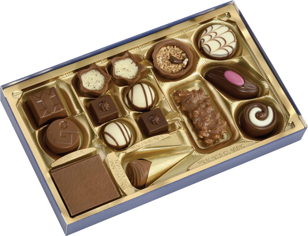 Zucker, Kakaobutter, Kakaomasse, VollMILCHpulver, HASELNÜSSE, MANDELN, MILCHzucker, MagerMILCHpulver, Glukosesirup, BUTTERreinfett, Palmöl, Kakaokerne, Invertzuckersirup, VollMILCH, Marc de Champagne, Glukose-Fruktose-Sirup, Emulgator (SOJA– und Sonnenblumenlecithin), SAHNEpulver, Orangenschalen, Zitronenschalen, Alkohol, Zitronensaftkonzentrat, Himbeerpüree, Kaffee, GERSTENmalzextrakt, Traubenzucker, natürliche Aromen, Kirschsaftkonzentrat, Aromen, WEIZENmehl, Invertzuckersirup, Frucht- und Pflanzenkonzentrate (Rettich, Apfel, schwarze Johannisbeere, Spirulina), Feuchthaltemittel (Invertase), EIklar, Salz, fettarmes Kakaopulver, Säuerungsmittel (Citronensäure), Aprikosenkerne, natürliches Orangenaroma. Kann andere SCHALENFRÜCHTE enthalten. Kakao: 30% mindestens in der Milch-Schokolade. Einige Spezialitäten enthalten Alkohol.