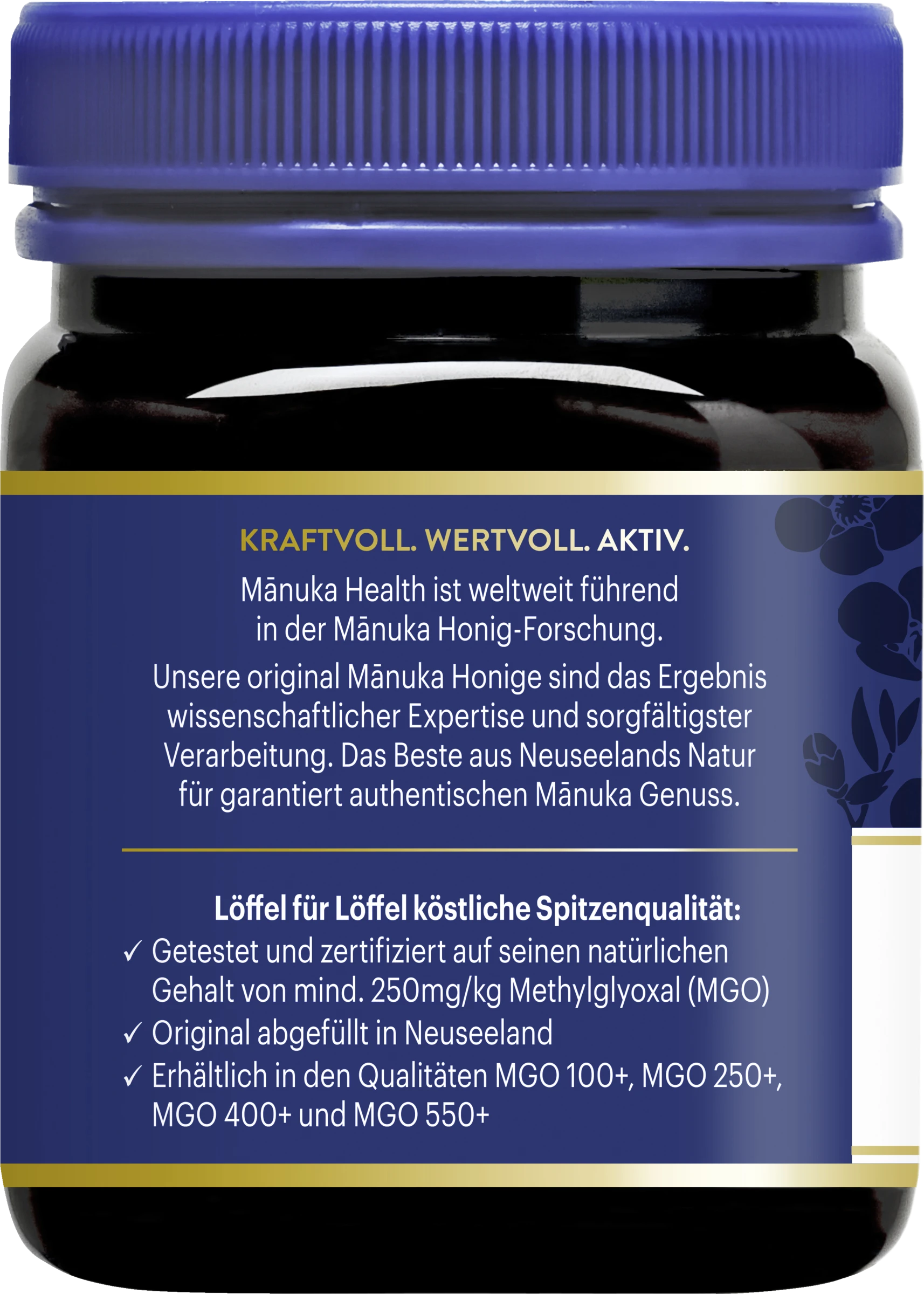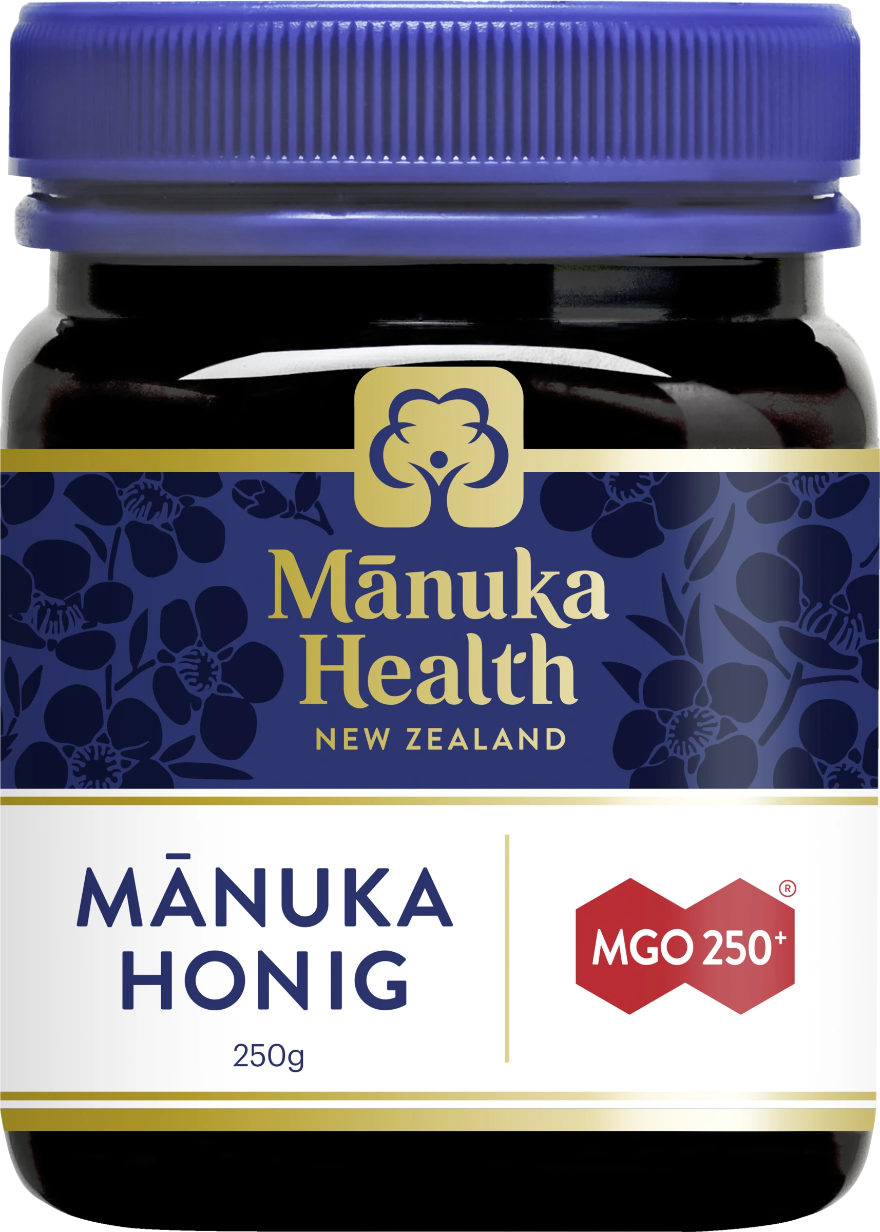 Originaler Manuka-Honig MGO™ 250 von Manuka Health aus Neuseeland. Dieser Honig ist getestet und zertifiziert auf einen natürlichen Methylglyoxal-Gehalt (MGO) von mindestens 250mg pro kg Honig – der wissenschaftlich nachgewiesene und natürliche Inhaltsstoff in Manuka-Honig. MGO™ Manuka-Honige von Manuka Health haben einen angenehm feinherben Geschmack und einen geschmeidig-samtigen Schmelz. Aktiv & lecker!
