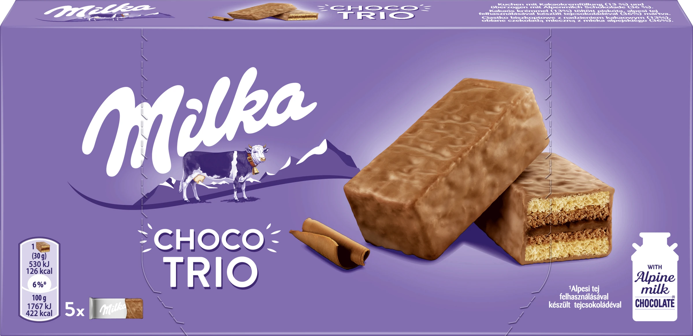 Ein Trio zum Verlieben. Kleine weiche Kuchen mit cremiger Füllung und zarter Schoko-Hülle. Schicht für Schicht ein Genuss: Milka Choco Trio wird nicht nur Schokoladenfans begeistern. Die kleinen, lockeren Kuchen, überzogen von zarter Milka Alpenmilch Schokolade, bestehen aus drei verschiedenen Schichten: einer unwiderstehlich köstlichen Schokoladenfüllung zwischen dunklem Schokoladenkuchen und hellem Biskuitteig. Die einzeln verpackten Milka Choco Trio eignen sich perfekt als leckerer Snack zwischendurch.