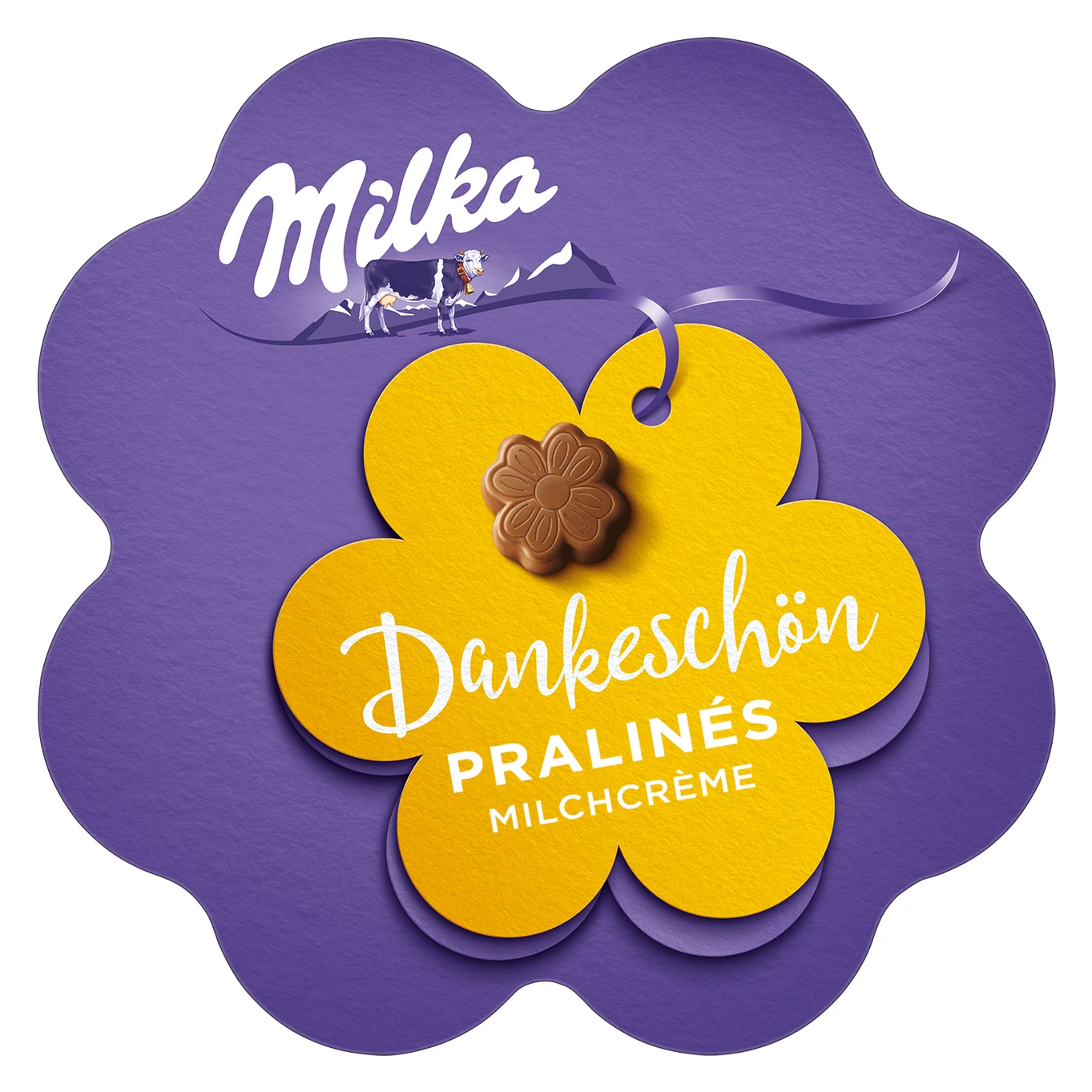 Für die kleine Geste zwischendurch oder die spontane Aufmerksamkeit, gibt es die attraktive Milka Dankeschön Impulspackung mit acht blütenförmigen Milka Pralinen gefüllt mit feiner Milchcrème, umhüllt von zart schmelzender Milka Alpenmilch Schokolade.