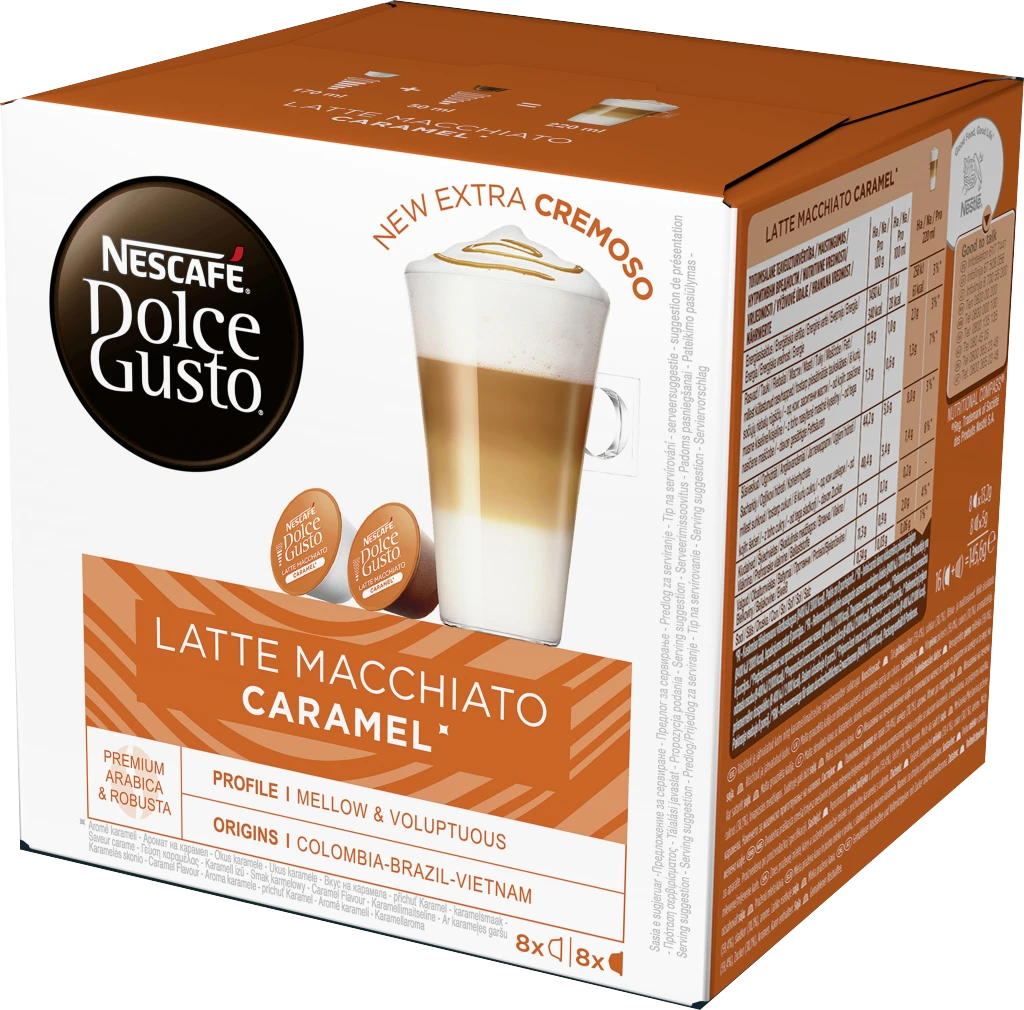 Mit NESCAFÉ® Dolce Gusto® Latte Macchiato Caramel wird jeder Moment zum Genusserlebnis.Verwöhnen Sie sich mit einer 3-Schichten-Köstlichkeit aus zartem Milchschaum und kräftigem Espresso mit einem Hauch Caramel. So kommen Sie zu jeder Tageszeit zu Ihrem persönlichen Coffee-Shop-Feeling zu Hause.