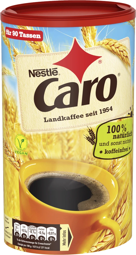 CARO besteht zu 100% aus natürlichen Zutaten. Auf den Zusatz von Aromen & Konservierungsstoffen wurde bewusst verzichtet. CARO Landkaffee ist frei von Koffein. Mit Getreide zu 100% aus deutschem Anbau. Für einen guten Landkaffee braucht es nicht viel. Deshalb besteht CARO Landkaffee auch nur aus 4 Zutaten. Roggen, Gerste und Gerstenmalz aus Deutschland…Zichorie aus Frankreich. Der Gesamtanteil an Getreide beträgt 86%, der Anteil an Zichorie 14%.